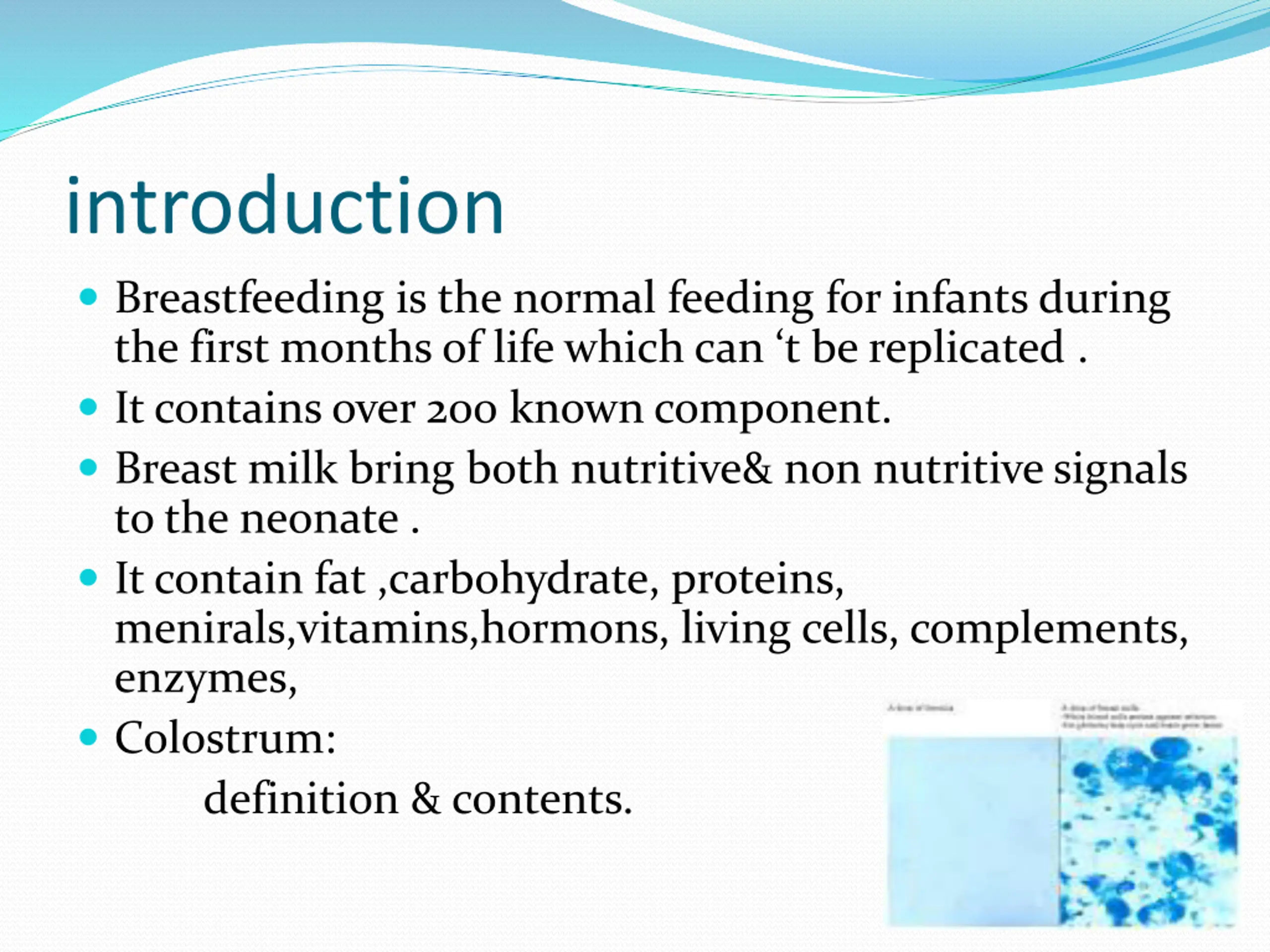 introduction Breastfeeding is the normal feeding for infants during the first months of life which can t be replicated . It contains over 200 known component. Breast milk bring both nutritive& non nutritive signals to the neonate . It contain fat ,carbohydrate, proteins, menirals,vitamins,hormons, living cells, complements, enzymes, Colostrum: definition & contents.