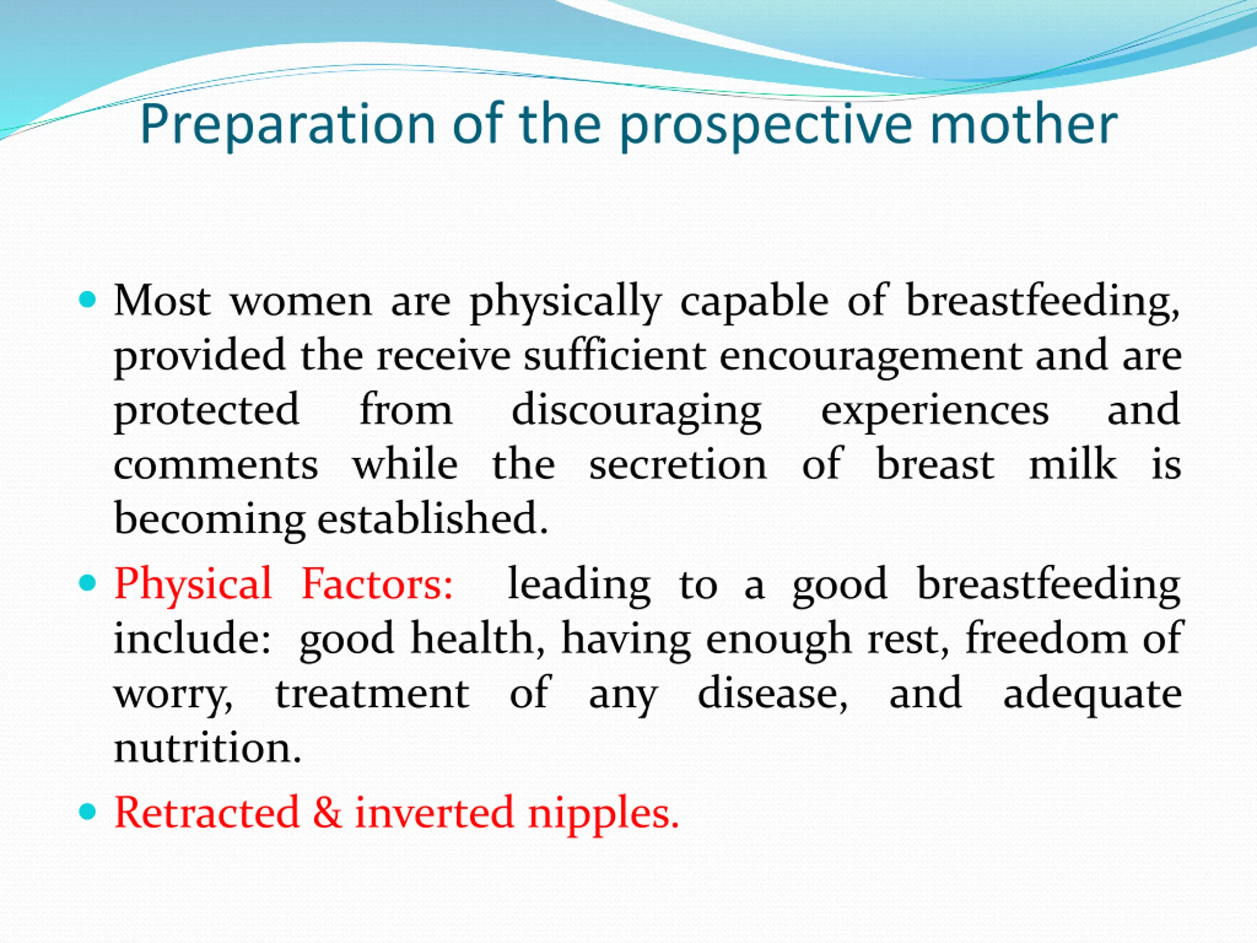 Preparation of the prospective mother Most women are physically capable of breastfeeding, provided the receive sufficient encouragement and are protected from discouraging comments while the secretion of breast milk is becoming established. Physical Factors: leading to a good breastfeeding include: good health, having enough rest, freedom of worry, treatment of any disease, and adequate nutrition. Retracted & inverted nipples. experiences and