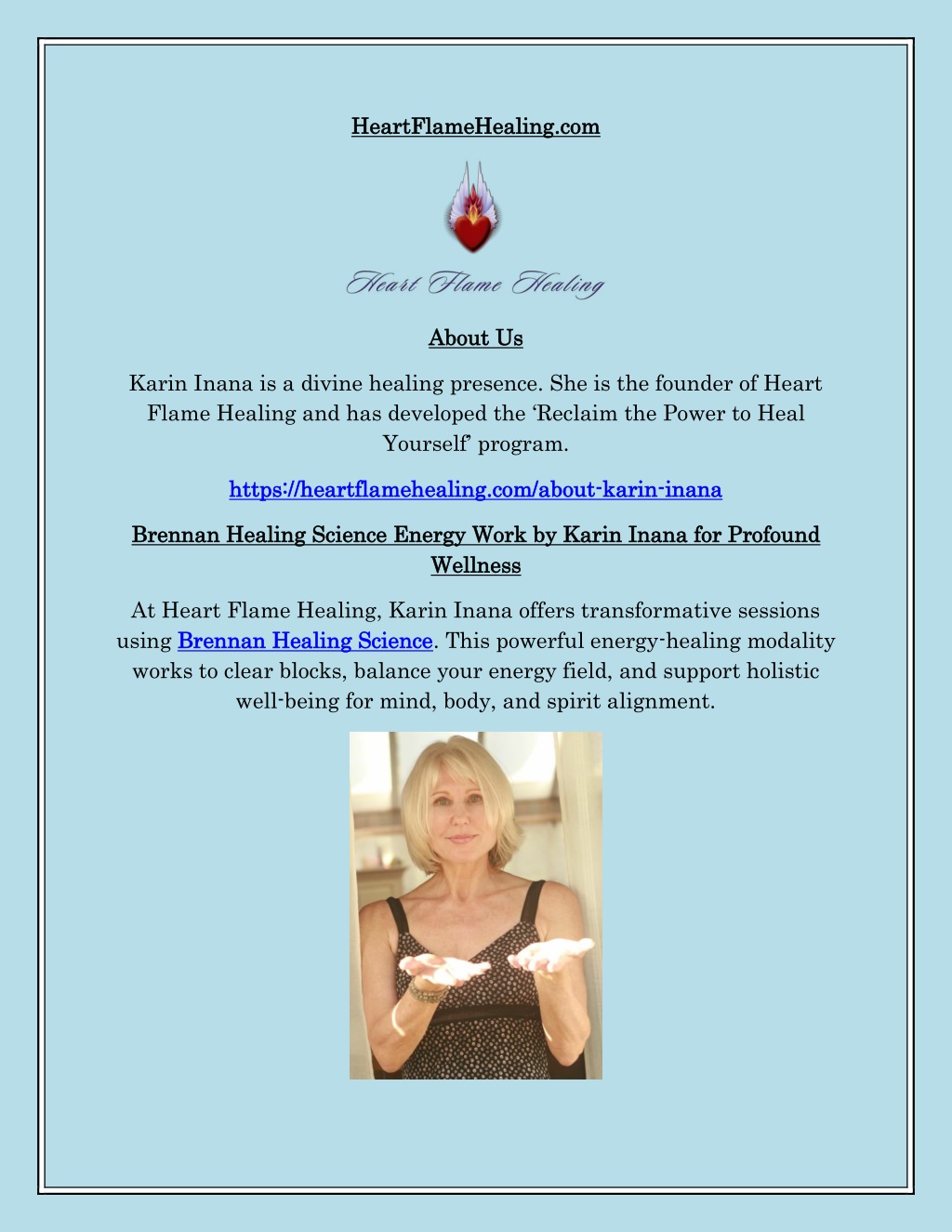 H He ea art rtFla Flame meH He eali alin ng. g.co com m A Abo bou ut t U Us s Karin Inana is a divine healing presence. She is the founder of Heart Flame Healing and has developed the Reclaim the Power to Heal Yourself program. h ht tt tps: ps:/ // /h he eart artf flame lameh he ea aling. ling.c co om m/ /abo abou ut t- -k karin arin- -i in na an na a B Bre ren nn na an n H He ea ali lin ng g Sci Scie en nc ce e E En ne er rgy gy W We Well lln ne ess Wo ork by rk by Kar ss Karin I in In na an na a fo for r Pr Pro of fo ou un nd d At Heart Flame Healing, Karin Inana offers transformative sessions using B Bre ren nn na an n H He ealin aling g S Scienc cience e. This powerful energy-healing modality works to clear blocks, balance your energy field, and support holistic well-being for mind, body, and spirit alignment.