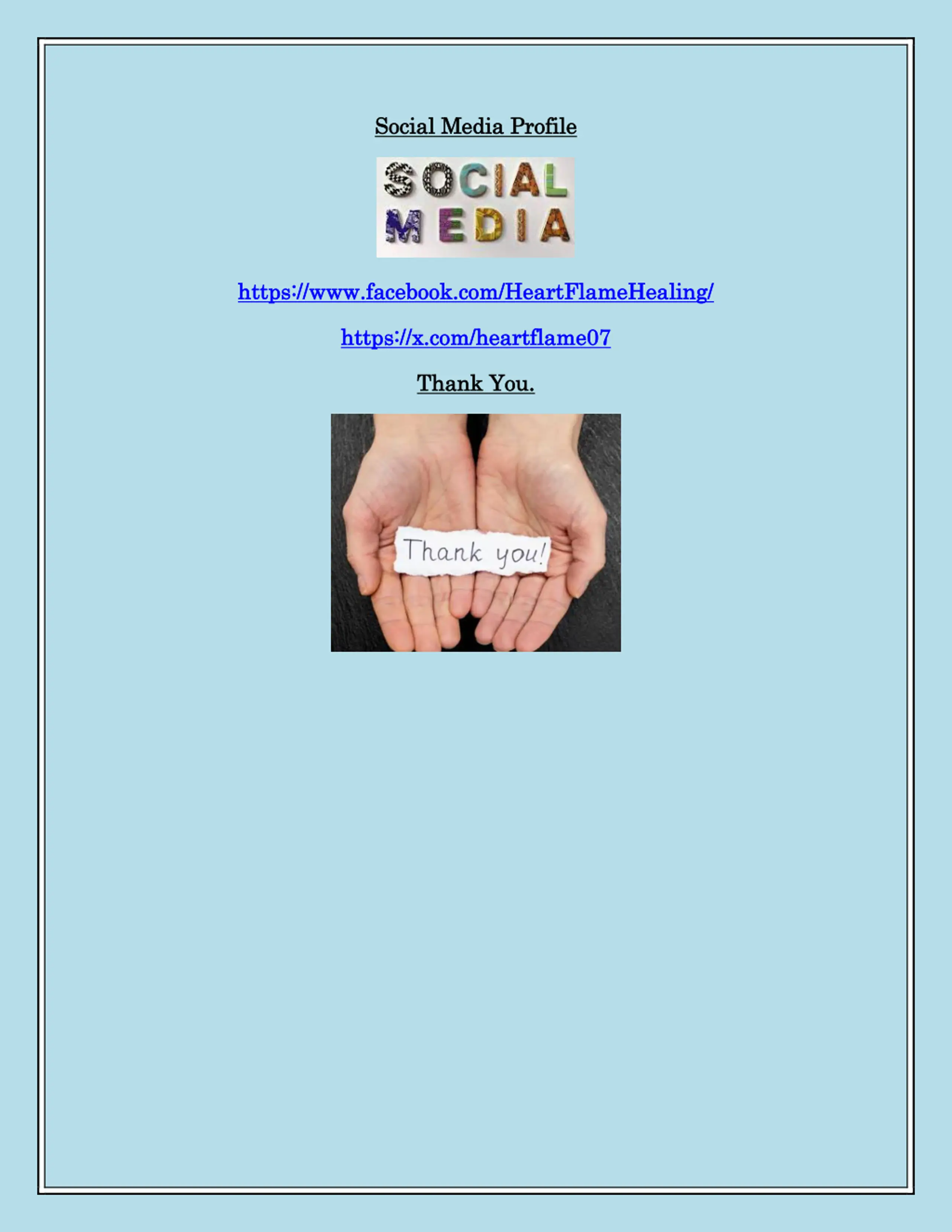 So Socia cial l M Me edia dia P Pro rof fi ile le h ht tt tps: ps:/ // /w www. ww.fa face ceb bo oo ok k. .c co om/ m/H He ear art tFlam Flame eH He eali alin ng g/ / h ht tt tps: ps:/ // /x x. .c co om/ m/h he ear art tflame flame07 07 Th Tha an nk k Y Yo ou u. .