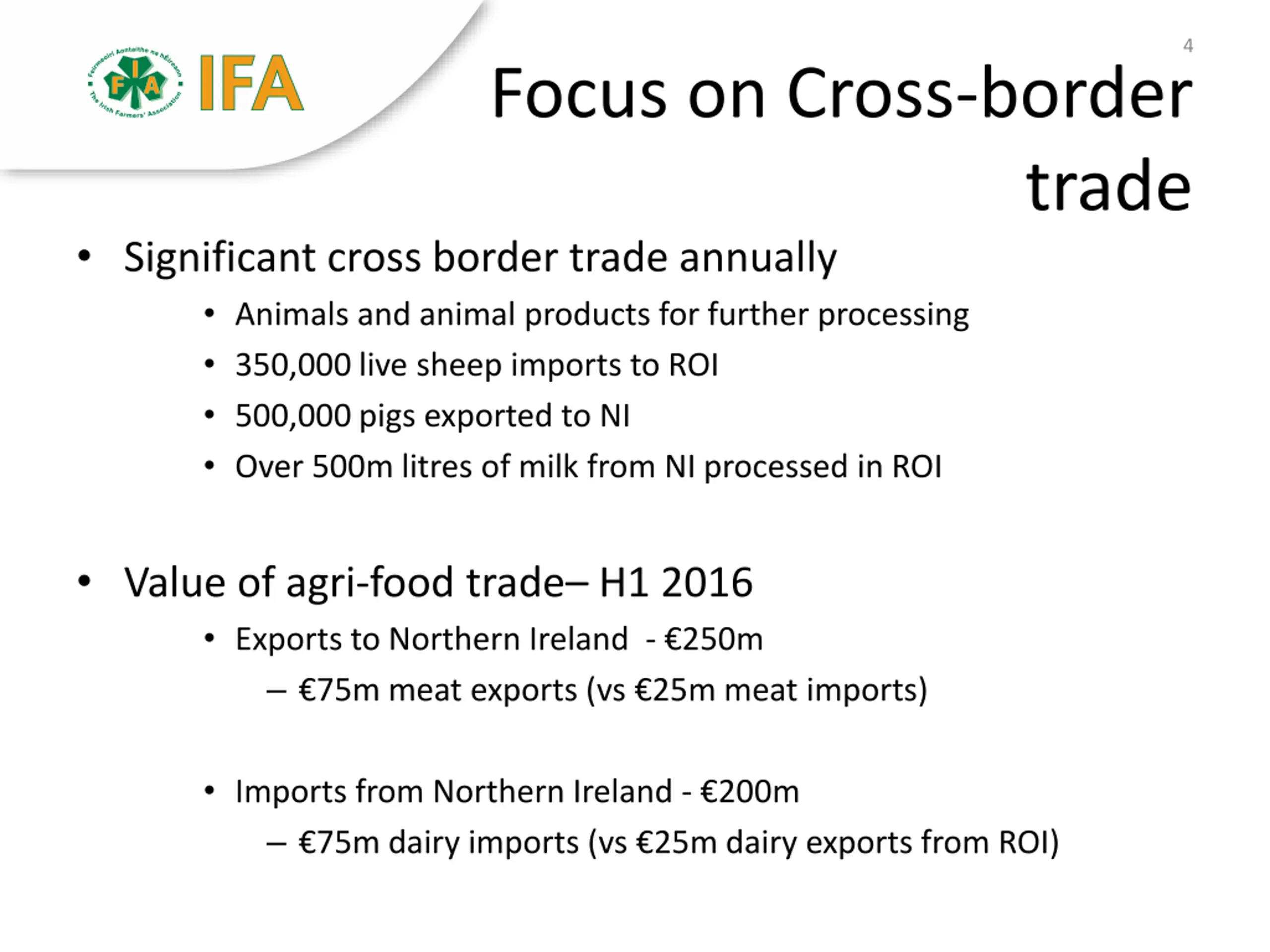 4 Focus on Cross-border trade Significant cross border trade annually Animals and animal products for further processing 350,000 live sheep imports to ROI 500,000 pigs exported to NI Over 500m litres of milk from NI processed in ROI Value of agri-food trade H1 2016 Exports to Northern Ireland - 250m 75m meat exports (vs 25m meat imports) Imports from Northern Ireland - 200m 75m dairy imports (vs 25m dairy exports from ROI)