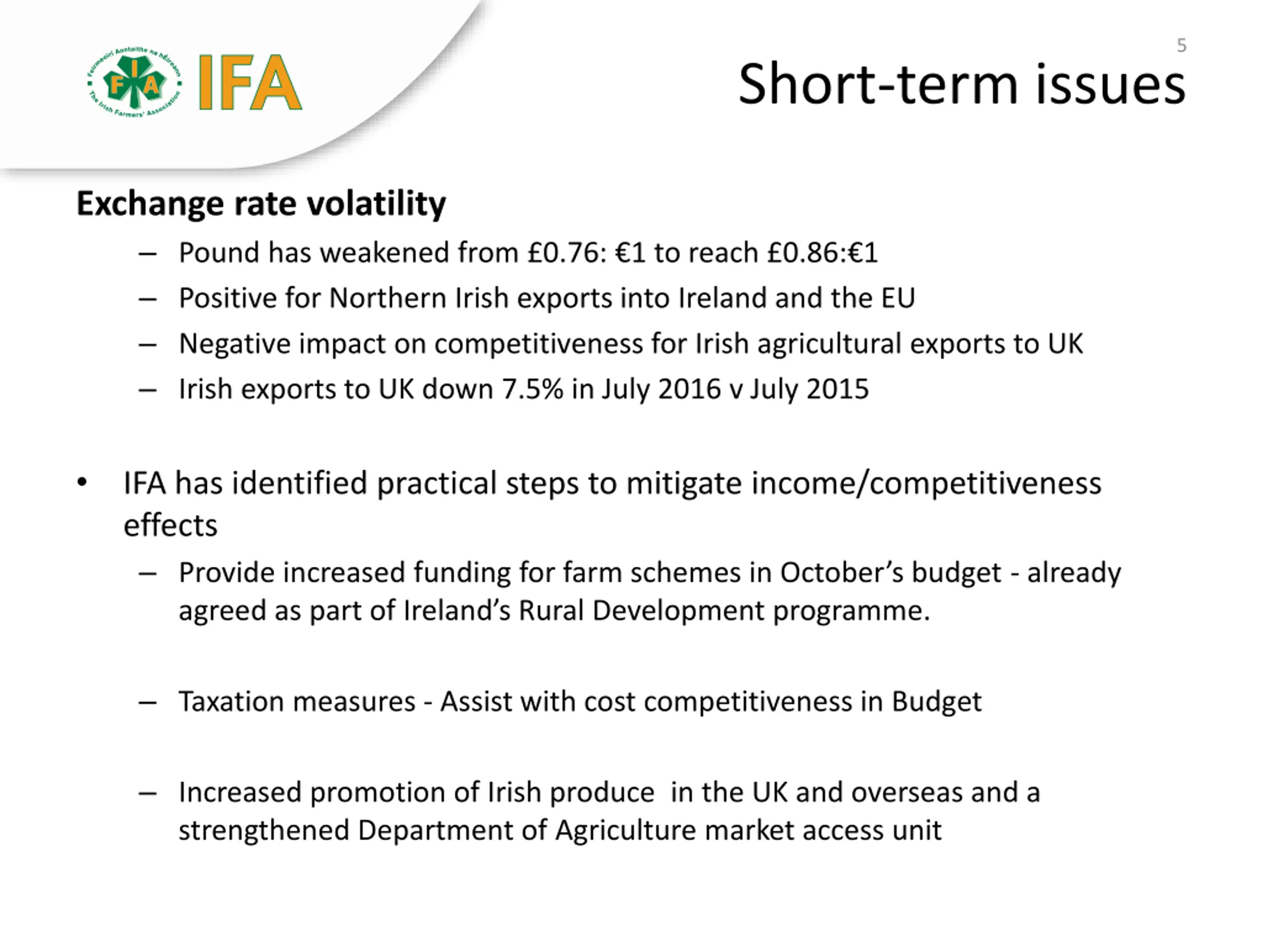 5 Short-term issues Exchange rate volatility Pound has weakened from 0.76: 1 to reach 0.86: 1 Positive for Northern Irish exports into Ireland and the EU Negative impact on competitiveness for Irish agricultural exports to UK Irish exports to UK down 7.5% in July 2016 v July 2015 IFA has identified practical steps to mitigate income/competitiveness effects Provide increased funding for farm schemes in October s budget - already agreed as part of Ireland s Rural Development programme. Taxation measures - Assist with cost competitiveness in Budget Increased promotion of Irish produce in the UK and overseas and a strengthened Department of Agriculture market access unit