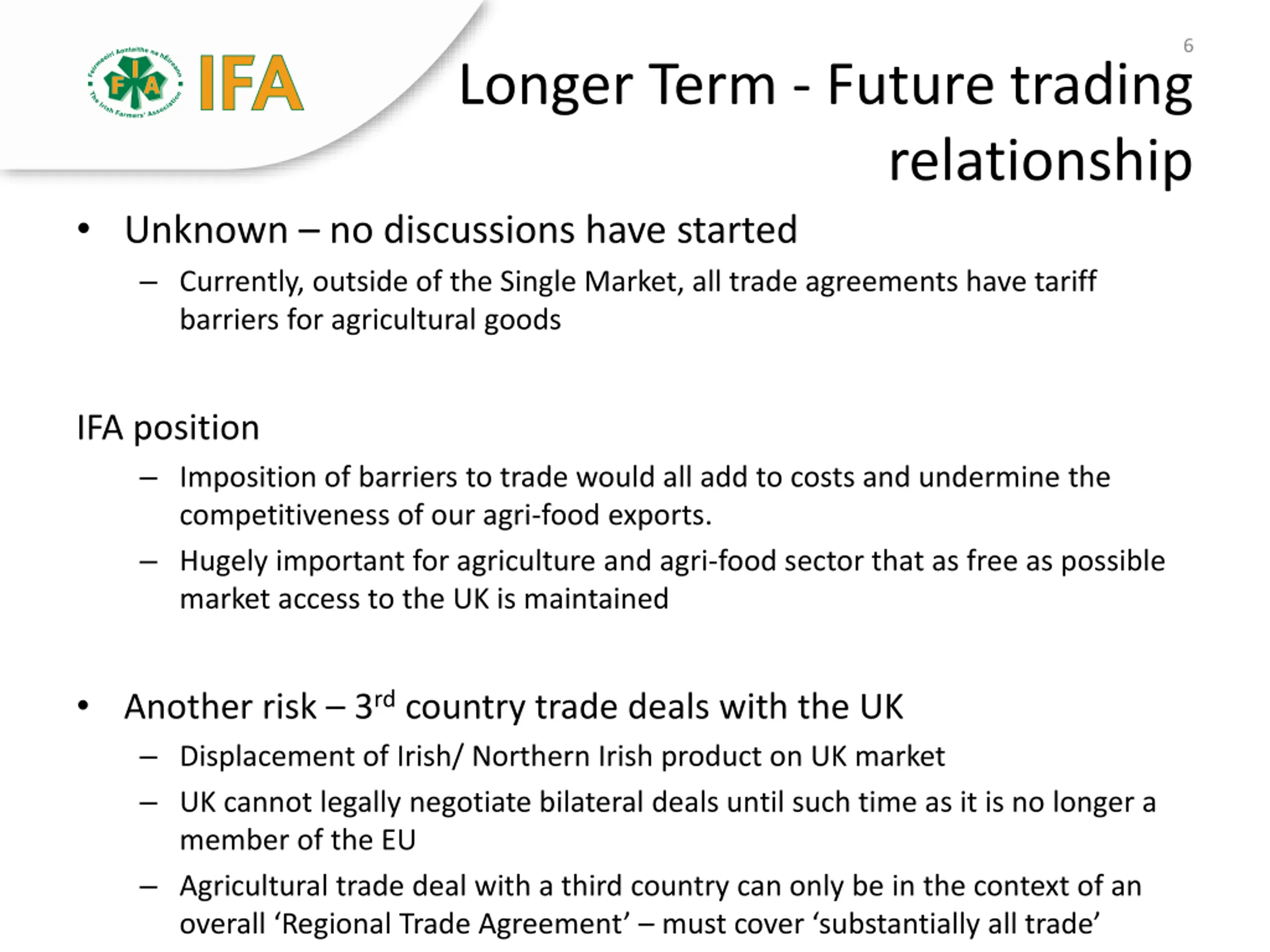6 Longer Term - Future trading relationship Unknown no discussions have started Currently, outside of the Single Market, all trade agreements have tariff barriers for agricultural goods IFA position Imposition of barriers to trade would all add to costs and undermine the competitiveness of our agri-food exports. Hugely important for agriculture and agri-food sector that as free as possible market access to the UK is maintained Another risk 3rd country trade deals with the UK Displacement of Irish/ Northern Irish product on UK market UK cannot legally negotiate bilateral deals until such time as it is no longer a member of the EU Agricultural trade deal with a third country can only be in the context of an overall Regional Trade Agreement must cover substantially all trade