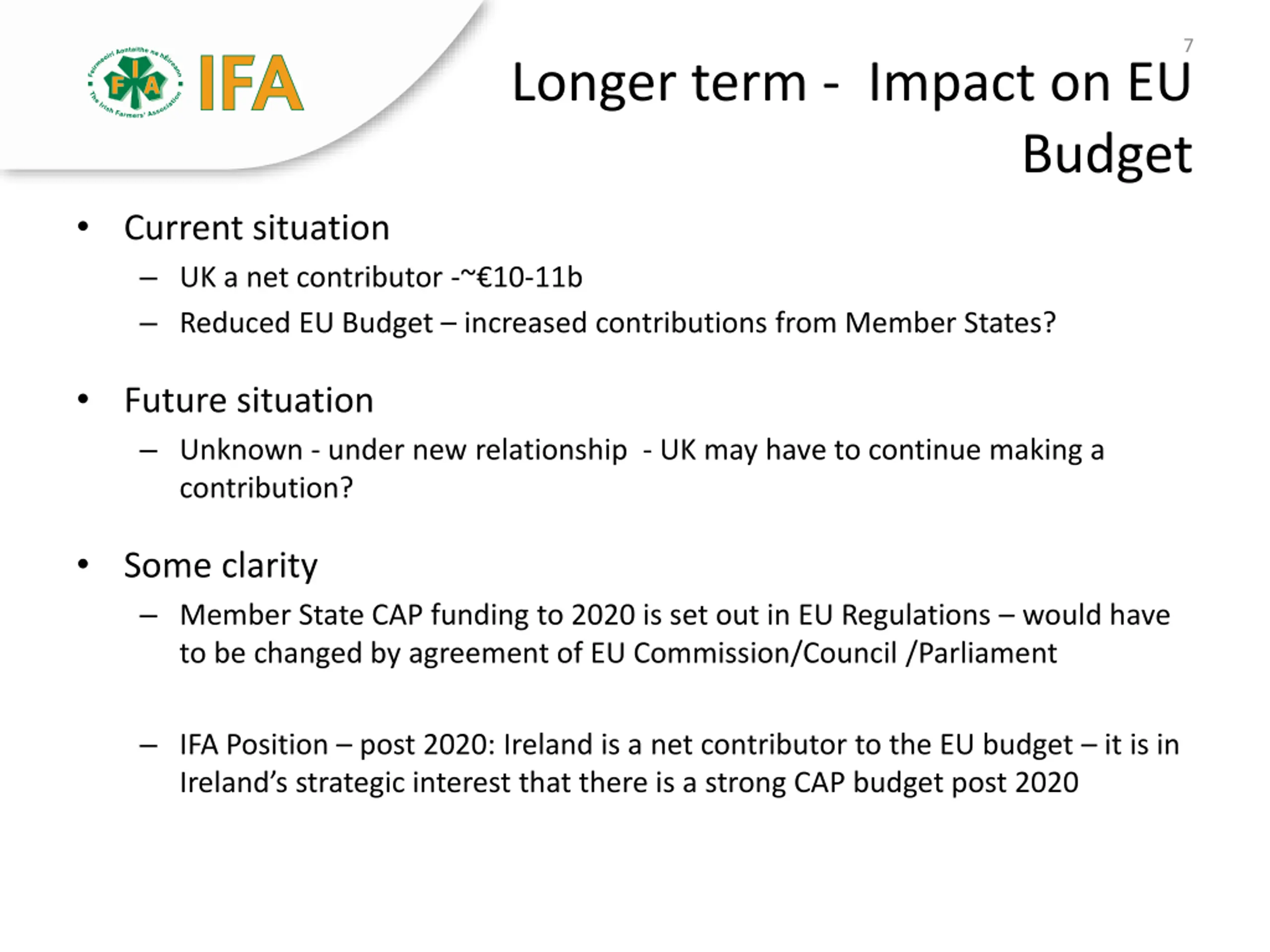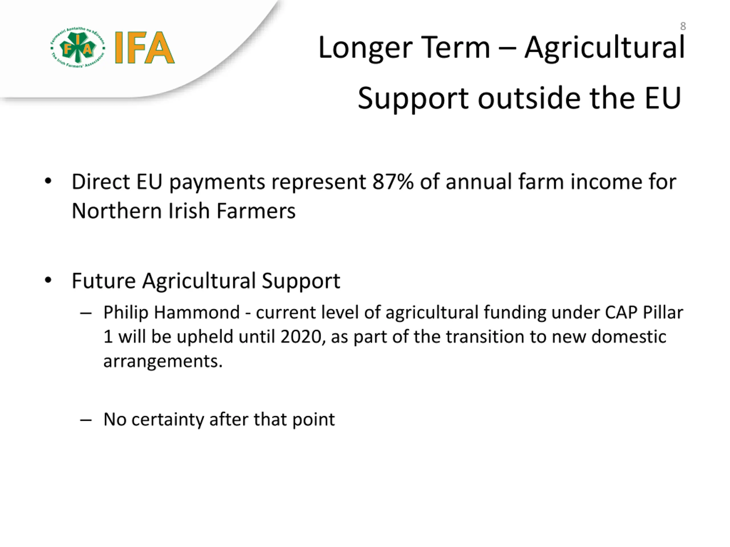 7 Longer term - Impact on EU Budget Current situation UK a net contributor -~ 10-11b Reduced EU Budget increased contributions from Member States? Future situation Unknown - under new relationship - UK may have to continue making a contribution? Some clarity Member State CAP funding to 2020 is set out in EU Regulations would have to be changed by agreement of EU Commission/Council /Parliament IFA Position post 2020: Ireland is a net contributor to the EU budget it is in Ireland s strategic interest that there is a strong CAP budget post 2020