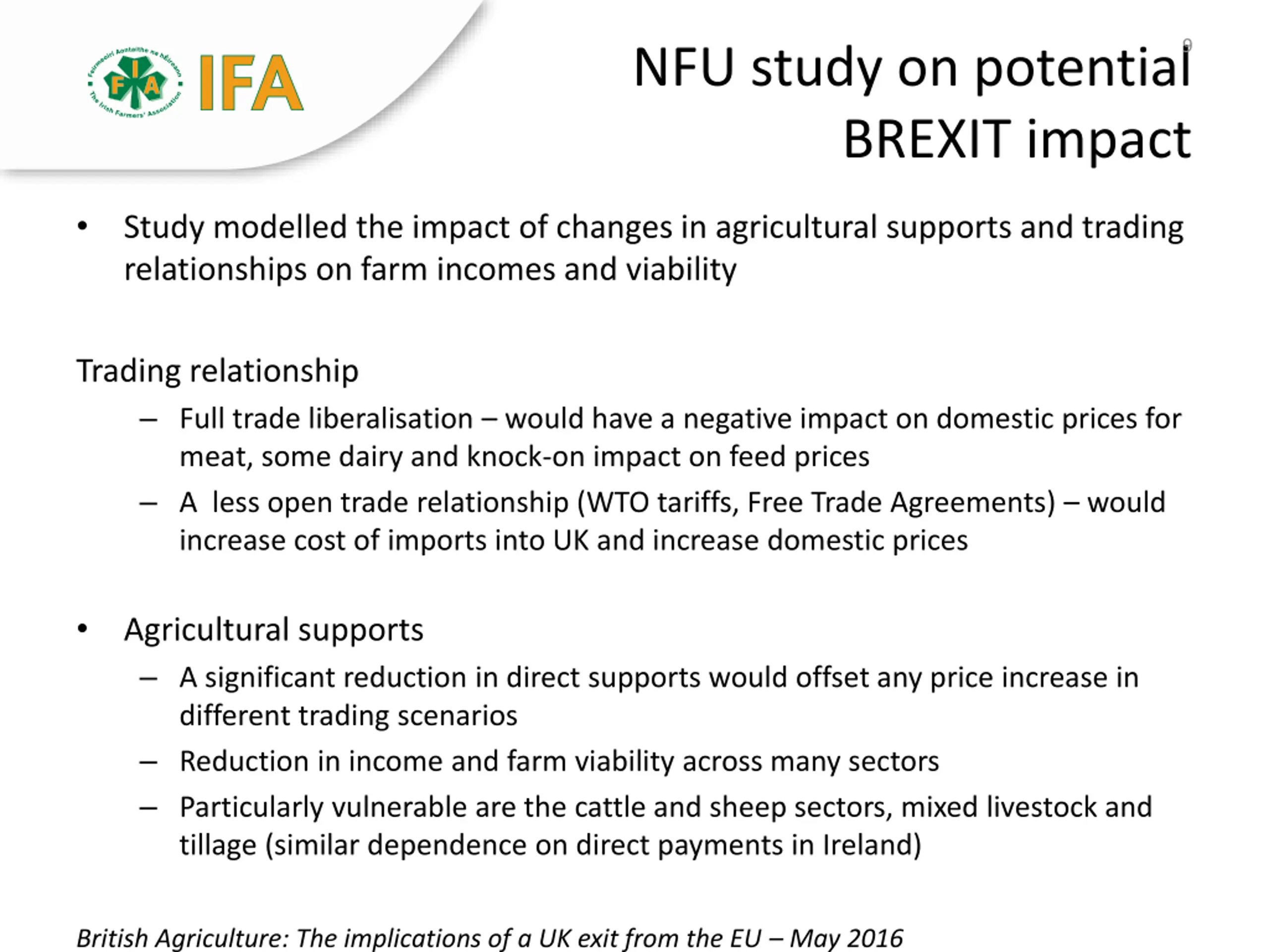 9 NFU study on potential BREXIT impact Study modelled the impact of changes in agricultural supports and trading relationships on farm incomes and viability Trading relationship Full trade liberalisation would have a negative impact on domestic prices for meat, some dairy and knock-on impact on feed prices A less open trade relationship (WTO tariffs, Free Trade Agreements) would increase cost of imports into UK and increase domestic prices Agricultural supports A significant reduction in direct supports would offset any price increase in different trading scenarios Reduction in income and farm viability across many sectors Particularly vulnerable are the cattle and sheep sectors, mixed livestock and tillage (similar dependence on direct payments in Ireland) British Agriculture: The implications of a UK exit from the EU May 2016