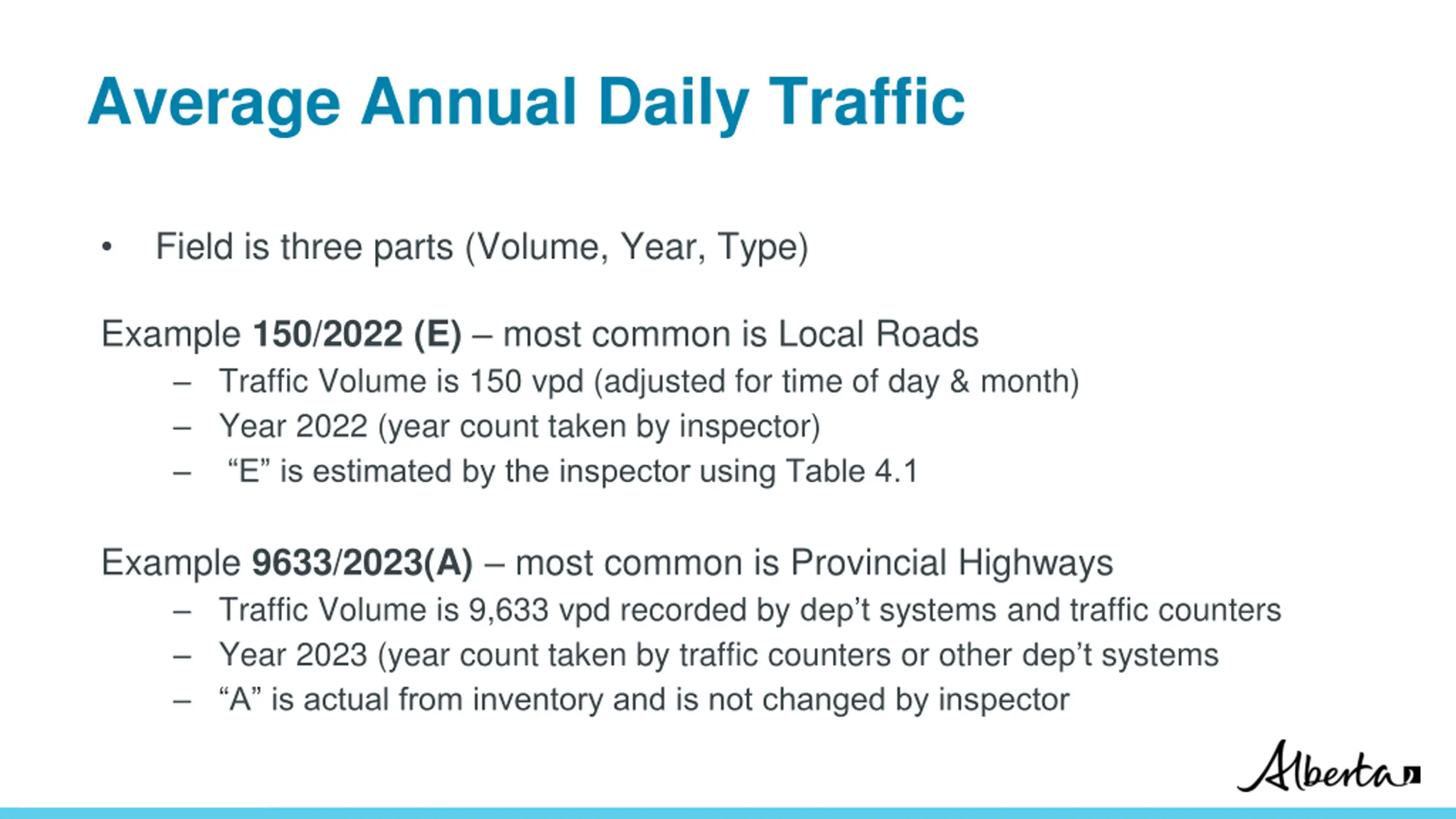 Average Annual Daily Traffic Field is three parts (Volume, Year, Type) Example 150/2022 (E) most common is Local Roads Traffic Volume is 150 vpd (adjusted for time of day & month) Year 2022 (year count taken by inspector) E is estimated by the inspector using Table 4.1 Example 9633/2023(A) most common is Provincial Highways Traffic Volume is 9,633 vpd recorded by dep t systems and traffic counters Year 2023 (year count taken by traffic counters or other dep t systems A is actual from inventory and is not changed by inspector