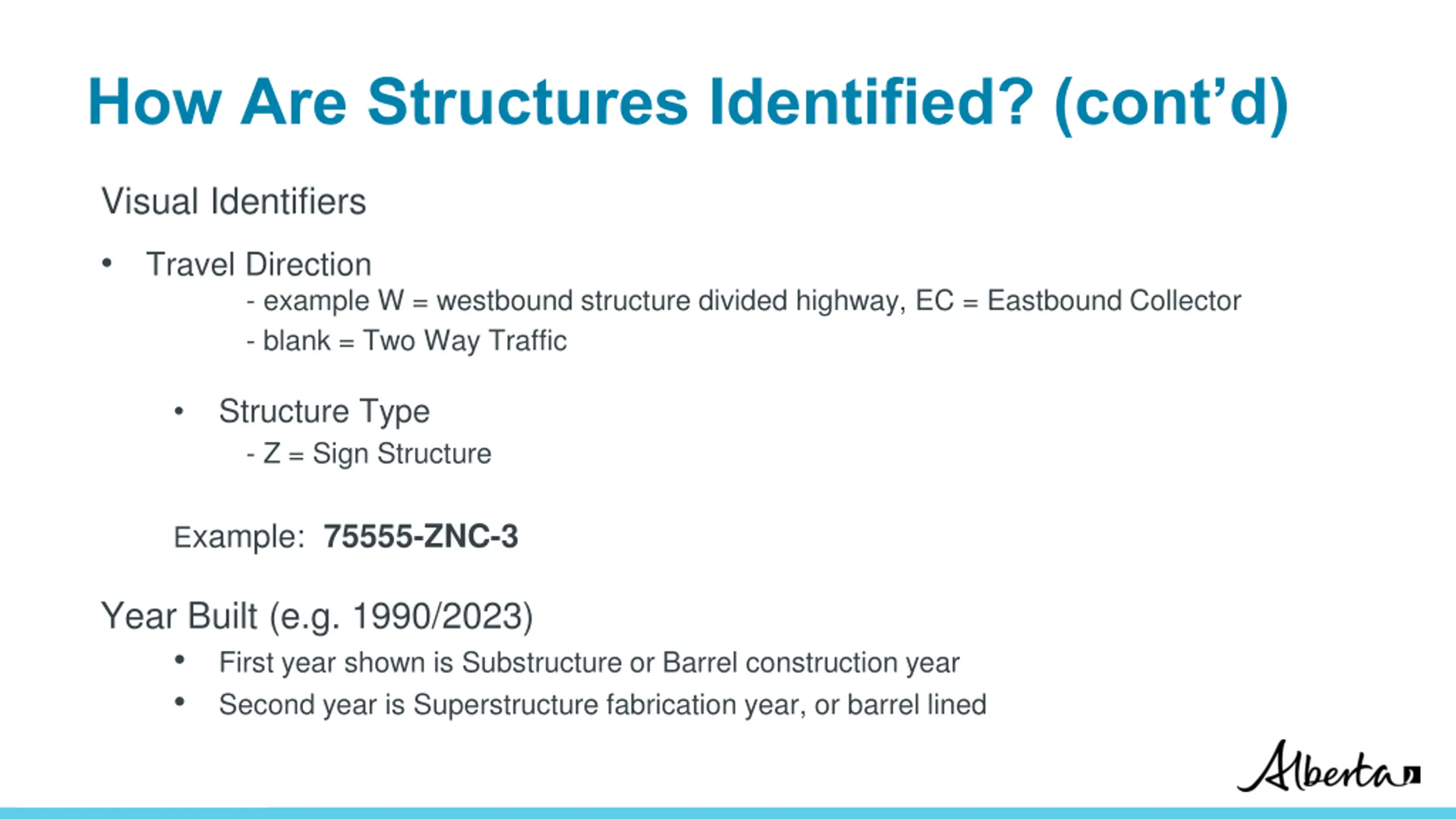 How Are Structures Identified? (contd) Visual Identifiers Travel Direction - example W = westbound structure divided highway, EC = Eastbound Collector - blank = Two Way Traffic Structure Type - Z = Sign Structure Example: 75555-ZNC-3 Year Built (e.g. 1990/2023) First year shown is Substructure or Barrel construction year Second year is Superstructure fabrication year, or barrel lined