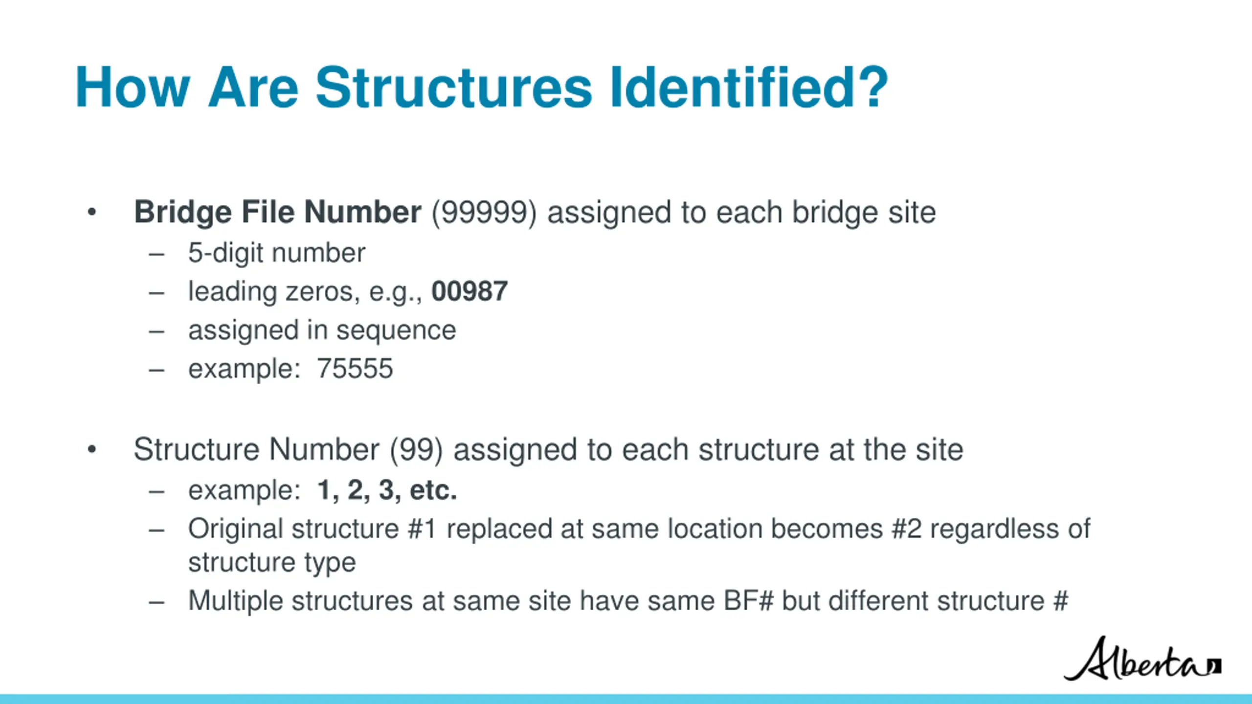 How Are Structures Identified? Bridge File Number (99999) assigned to each bridge site 5-digit number leading zeros, e.g., 00987 assigned in sequence example: 75555 Structure Number (99) assigned to each structure at the site example: 1, 2, 3, etc. Original structure #1 replaced at same location becomes #2 regardless of structure type Multiple structures at same site have same BF# but different structure #