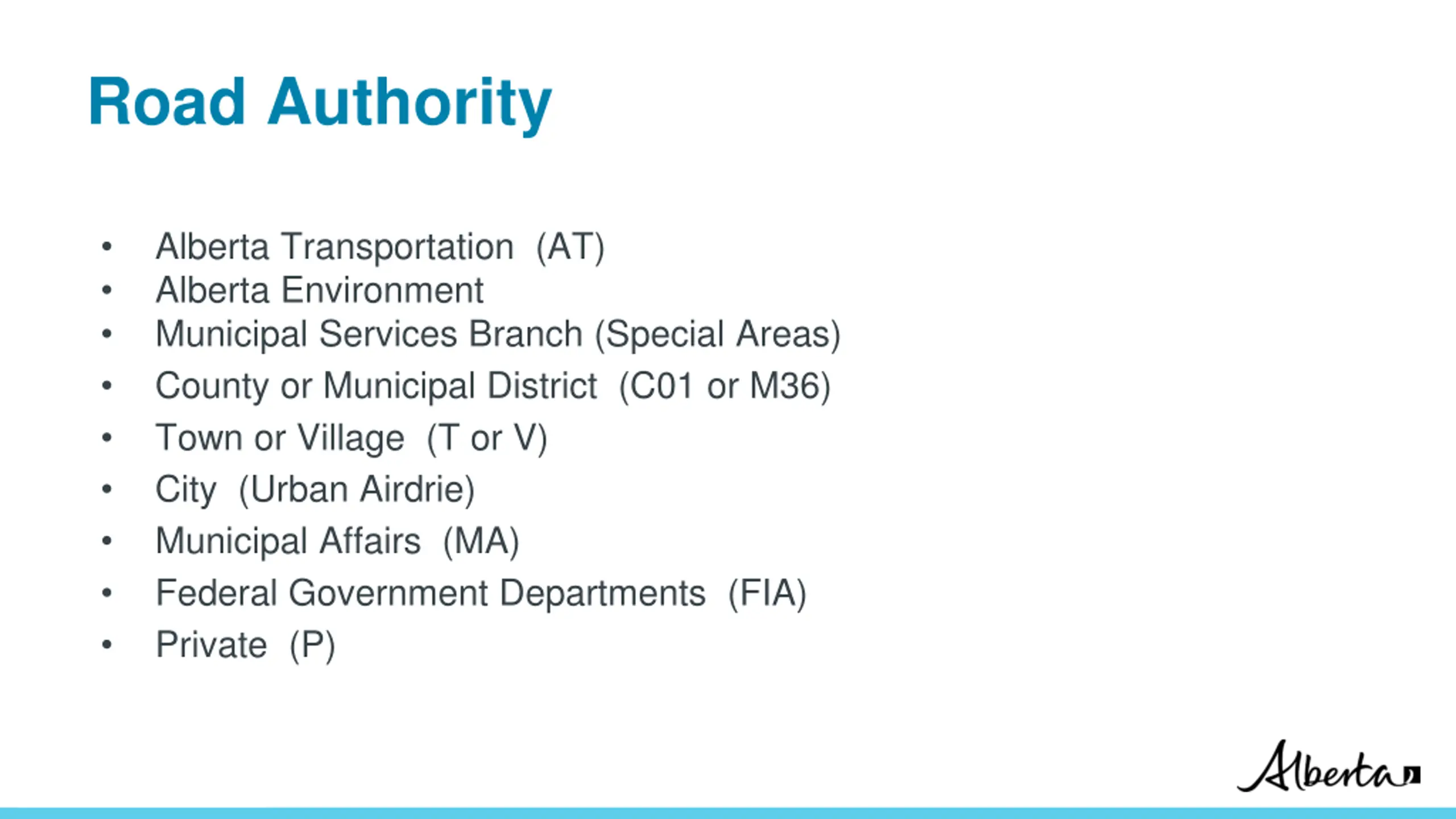 Road Authority Alberta Transportation (AT) Alberta Environment Municipal Services Branch (Special Areas) County or Municipal District (C01 or M36) Town or Village (T or V) City (Urban Airdrie) Municipal Affairs (MA) Federal Government Departments (FIA) Private (P)