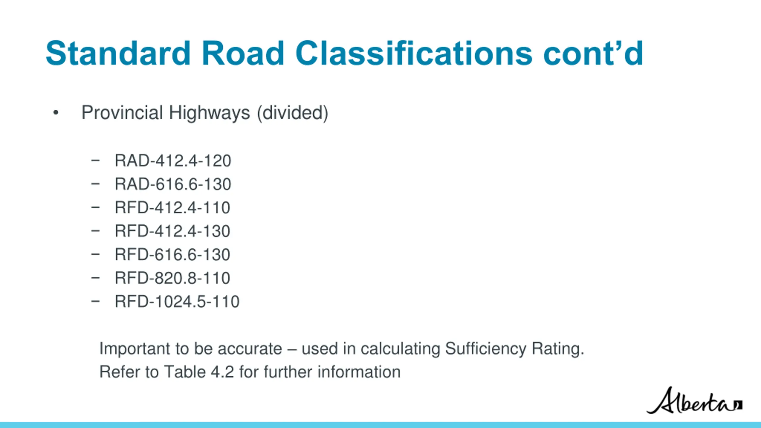 Standard Road Classifications contd Provincial Highways (divided) RAD-412.4-120 RAD-616.6-130 RFD-412.4-110 RFD-412.4-130 RFD-616.6-130 RFD-820.8-110 RFD-1024.5-110 Important to be accurate used in calculating Sufficiency Rating. Refer to Table 4.2 for further information