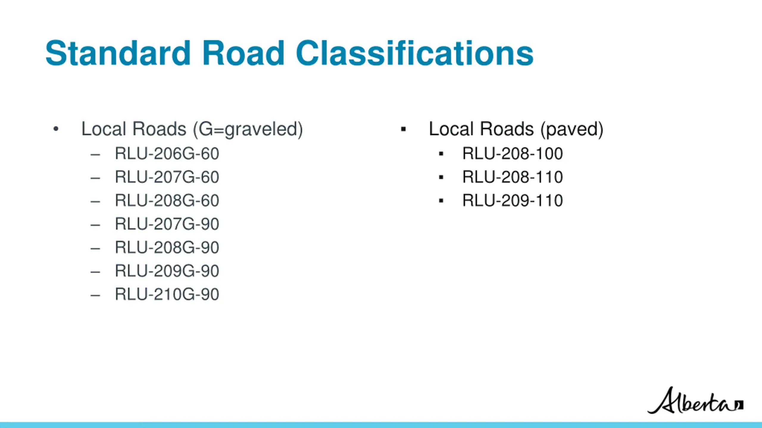 Standard Road Classifications Local Roads (G=graveled) RLU-206G-60 RLU-207G-60 RLU-208G-60 RLU-207G-90 RLU-208G-90 RLU-209G-90 RLU-210G-90 Local Roads (paved) RLU-208-100 RLU-208-110 RLU-209-110