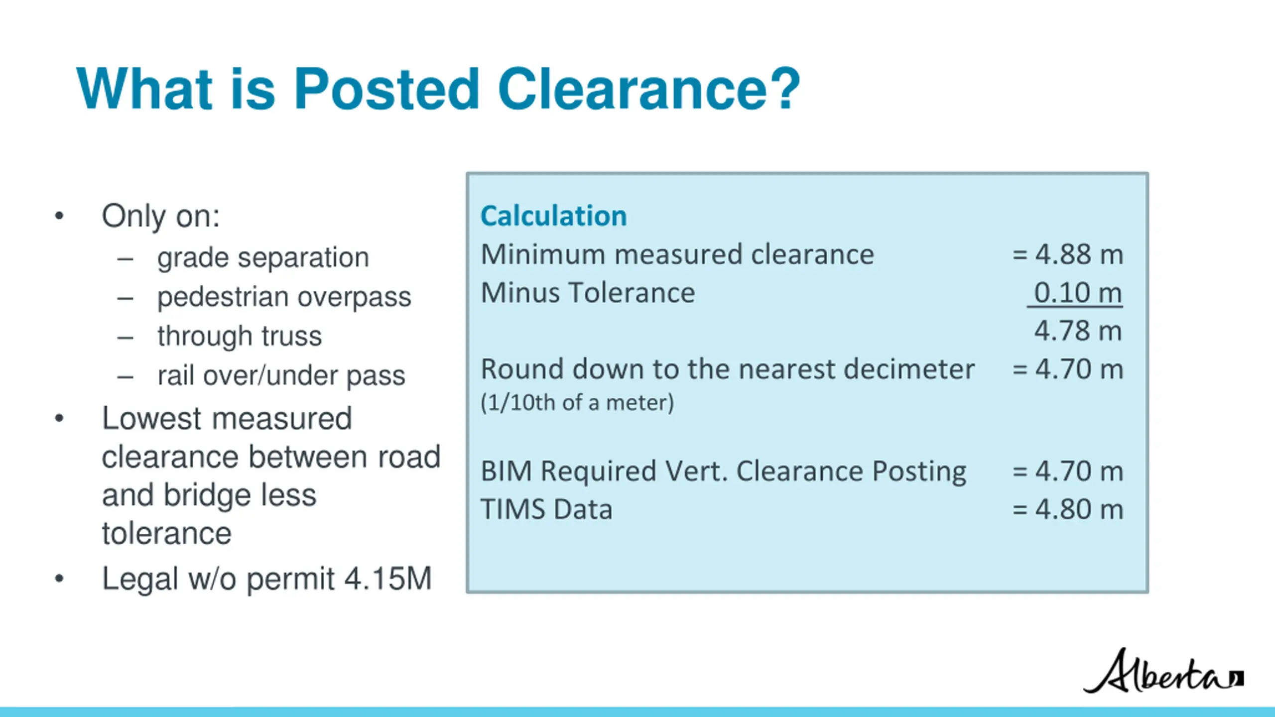 What is Posted Clearance? Only on: grade separation pedestrian overpass through truss rail over/under pass Lowest measured clearance between road and bridge less tolerance Legal w/o permit 4.15M Calculation Minimum measured clearance Minus Tolerance = 4.88 m 0.10 m 4.78 m = 4.70 m Round down to the nearest decimeter (1/10th of a meter) BIM Required Vert. Clearance Posting TIMS Data = 4.70 m = 4.80 m