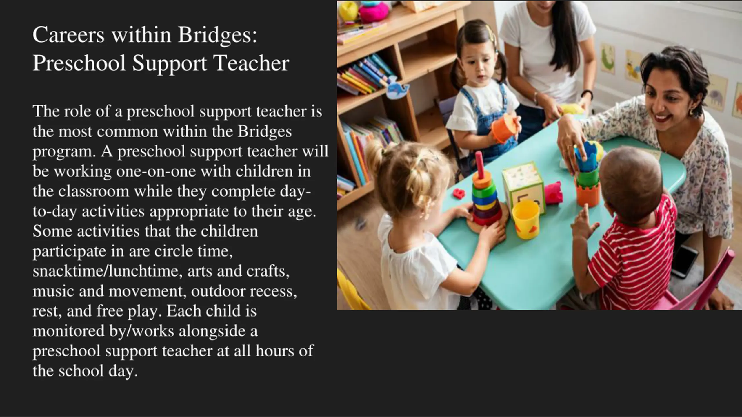 Careers within Bridges: Preschool Support Teacher The role of a preschool support teacher is the most common within the Bridges program. A preschool support teacher will be working one-on-one with children in the classroom while they complete day- to-day activities appropriate to their age. Some activities that the children participate in are circle time, snacktime/lunchtime, arts and crafts, music and movement, outdoor recess, rest, and free play. Each child is monitored by/works alongside a preschool support teacher at all hours of the school day.