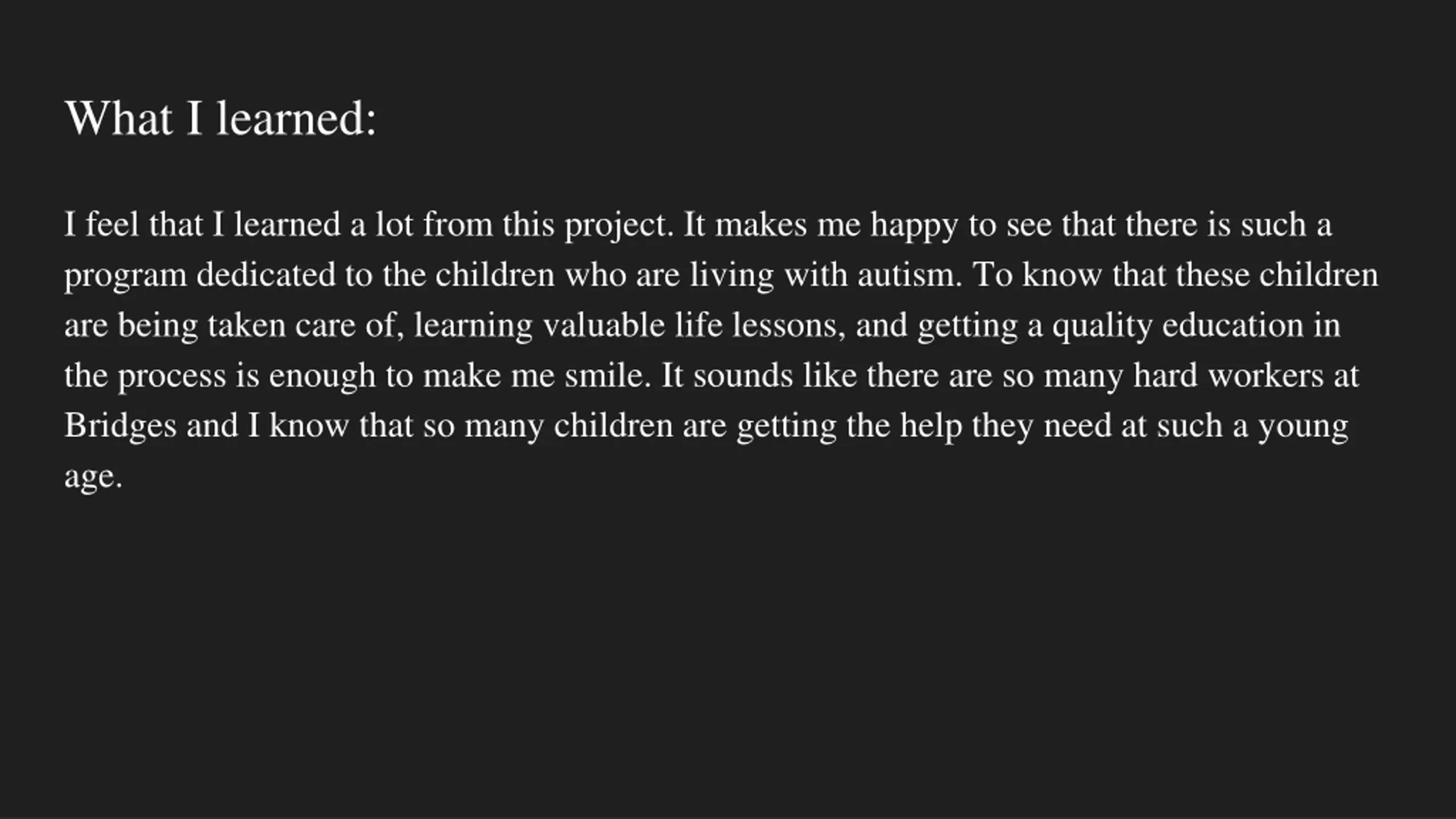 What I learned: I feel that I learned a lot from this project. It makes me happy to see that there is such a program dedicated to the children who are living with autism. To know that these children are being taken care of, learning valuable life lessons, and getting a quality education in the process is enough to make me smile. It sounds like there are so many hard workers at Bridges and I know that so many children are getting the help they need at such a young age.