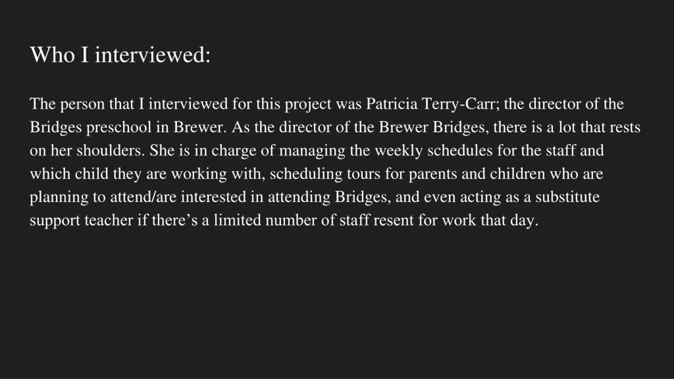 Who I interviewed: The person that I interviewed for this project was Patricia Terry-Carr; the director of the Bridges preschool in Brewer. As the director of the Brewer Bridges, there is a lot that rests on her shoulders. She is in charge of managing the weekly schedules for the staff and which child they are working with, scheduling tours for parents and children who are planning to attend/are interested in attending Bridges, and even acting as a substitute support teacher if there s a limited number of staff resent for work that day.
