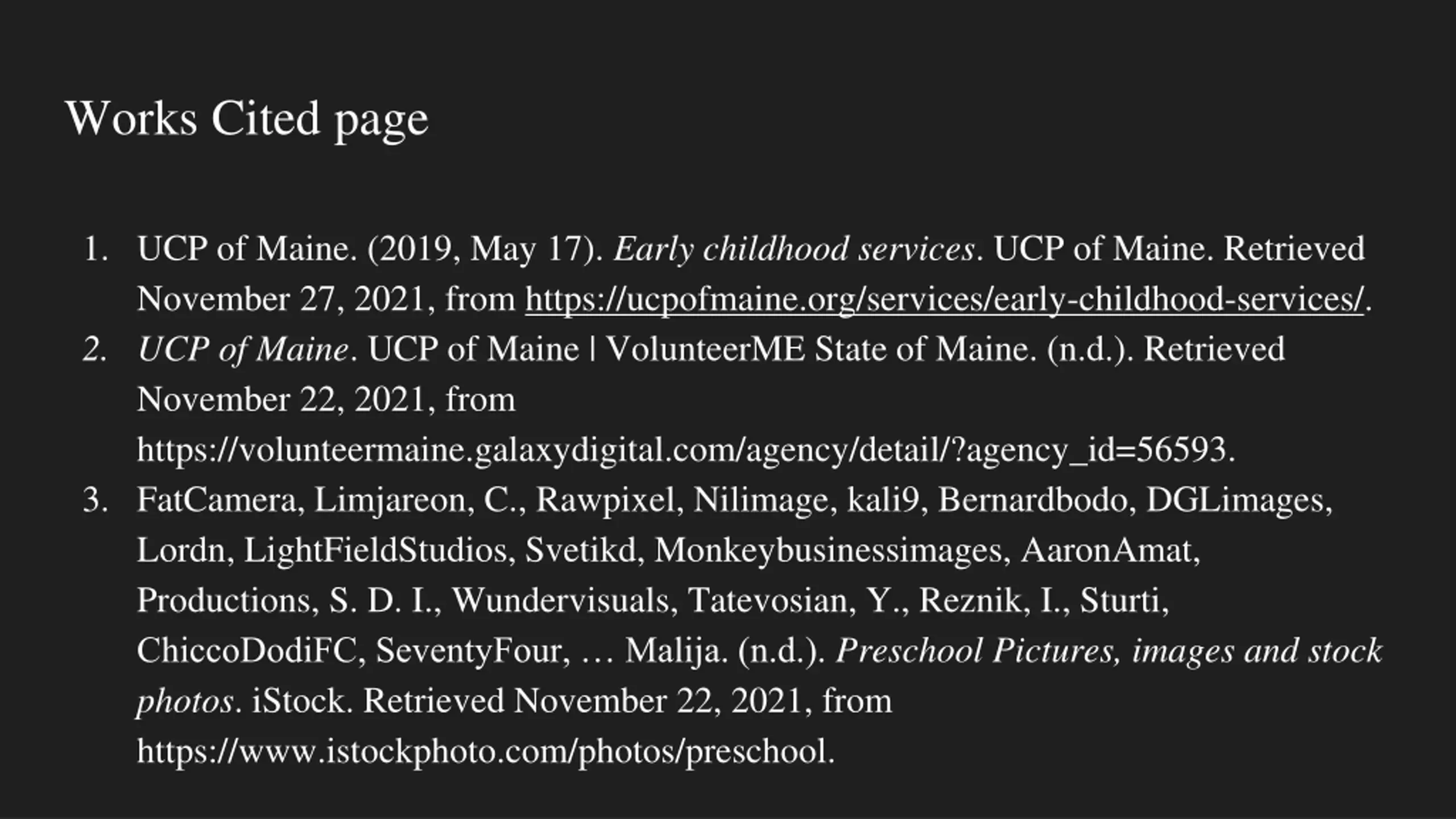 Works Cited page 1. UCP of Maine. (2019, May 17). Early childhood services. UCP of Maine. Retrieved November 27, 2021, from https://ucpofmaine.org/services/early-childhood-services/. 2. UCP of Maine. UCP of Maine | VolunteerME State of Maine. (n.d.). Retrieved November 22, 2021, from https://volunteermaine.galaxydigital.com/agency/detail/?agency_id=56593. 3. FatCamera, Limjareon, C., Rawpixel, Nilimage, kali9, Bernardbodo, DGLimages, Lordn, LightFieldStudios, Svetikd, Monkeybusinessimages, AaronAmat, Productions, S. D. I., Wundervisuals, Tatevosian, Y., Reznik, I., Sturti, ChiccoDodiFC, SeventyFour, Malija. (n.d.). Preschool Pictures, images and stock photos. iStock. Retrieved November 22, 2021, from https://www.istockphoto.com/photos/preschool.