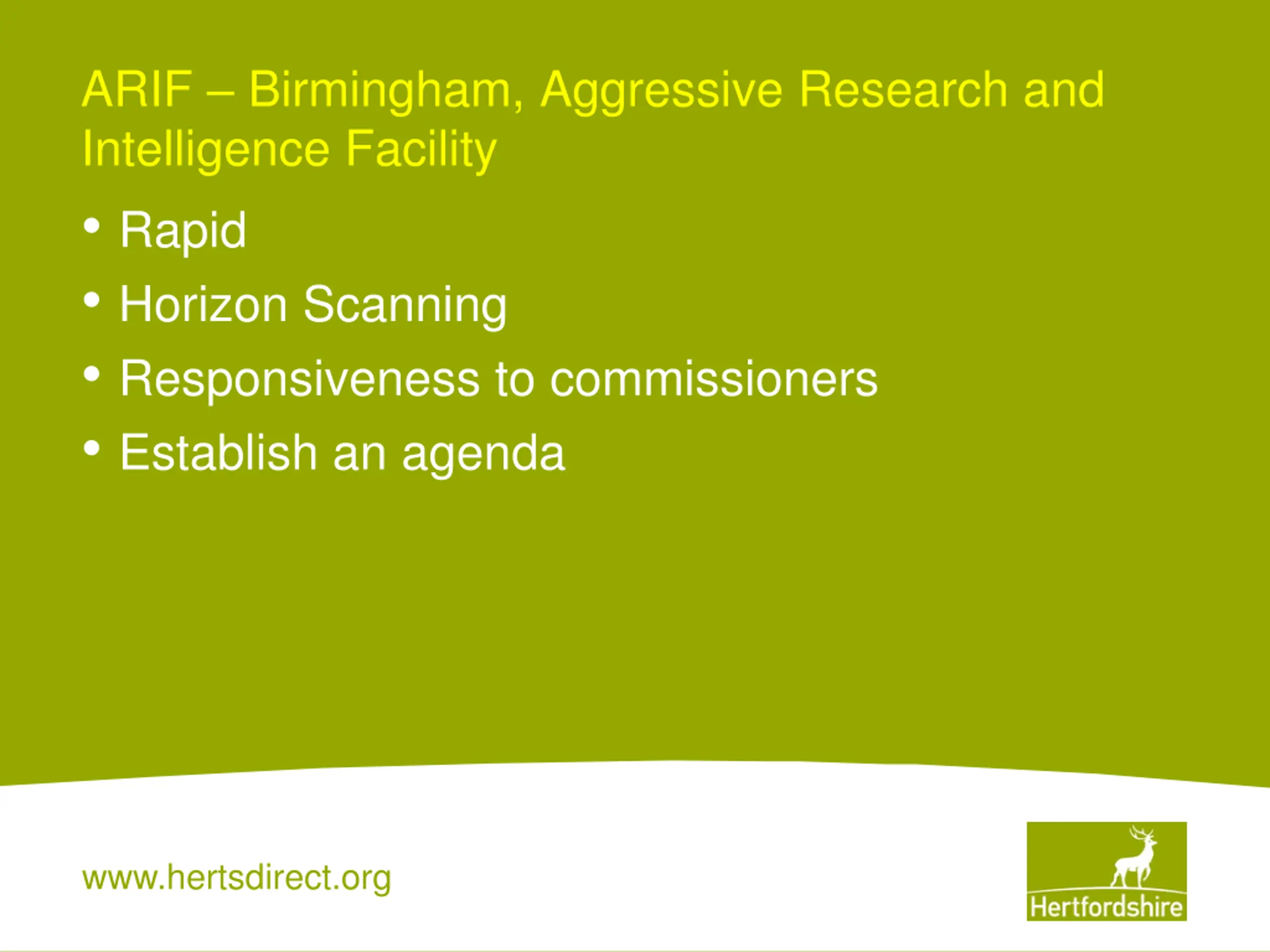 ARIF Birmingham, Aggressive Research and Intelligence Facility Rapid Horizon Scanning Responsiveness to commissioners Establish an agenda www.hertsdirect.org