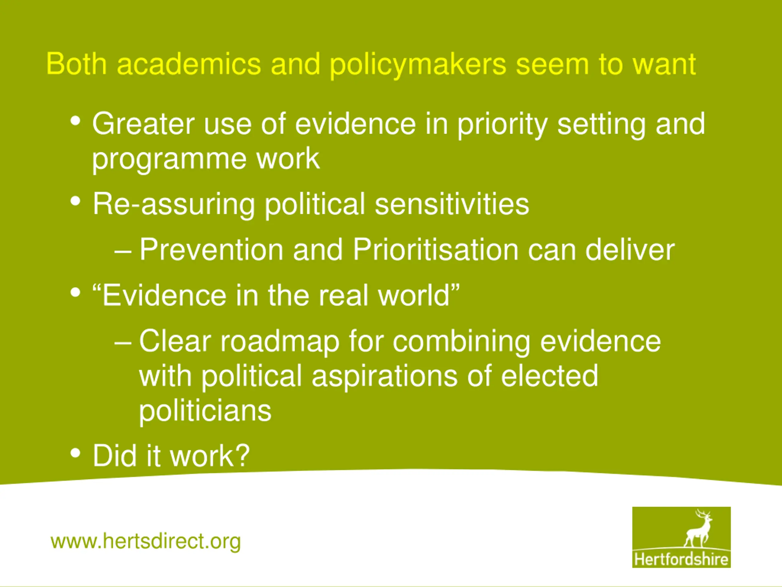 Both academics and policymakers seem to want Greater use of evidence in priority setting and programme work Re-assuring political sensitivities Prevention and Prioritisation can deliver Evidence in the real world Clear roadmap for combining evidence with political aspirations of elected politicians Did it work? www.hertsdirect.org