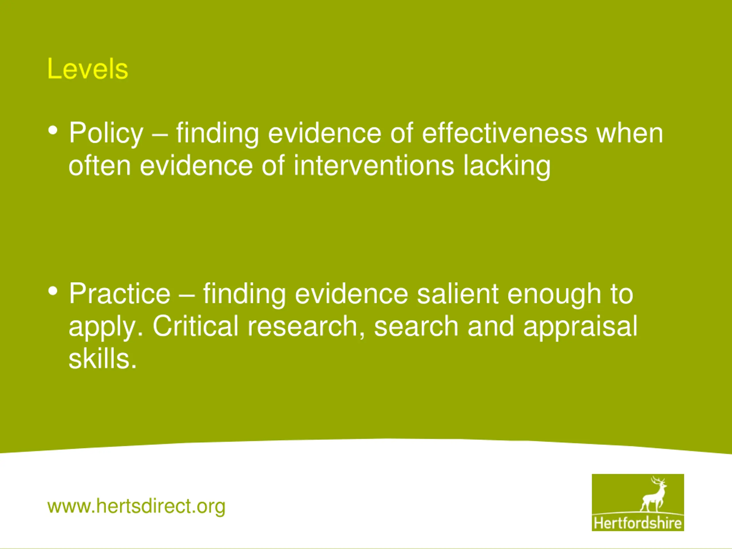 Levels Policy finding evidence of effectiveness when often evidence of interventions lacking Practice finding evidence salient enough to apply. Critical research, search and appraisal skills. www.hertsdirect.org