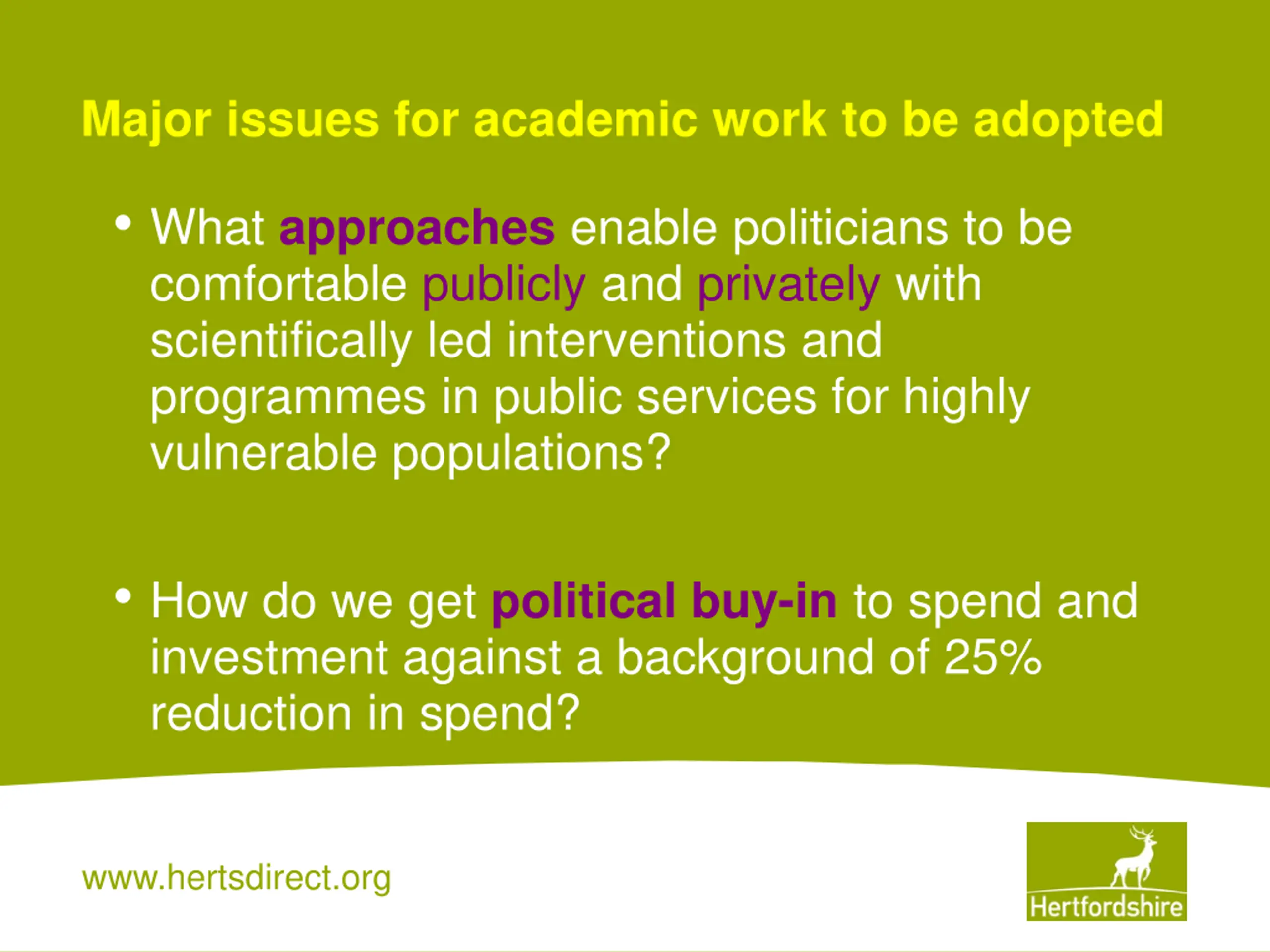 Major issues for academic work to be adopted What approaches enable politicians to be comfortable publicly and privately with scientifically led interventions and programmes in public services for highly vulnerable populations? How do we get political buy-in to spend and investment against a background of 25% reduction in spend? www.hertsdirect.org