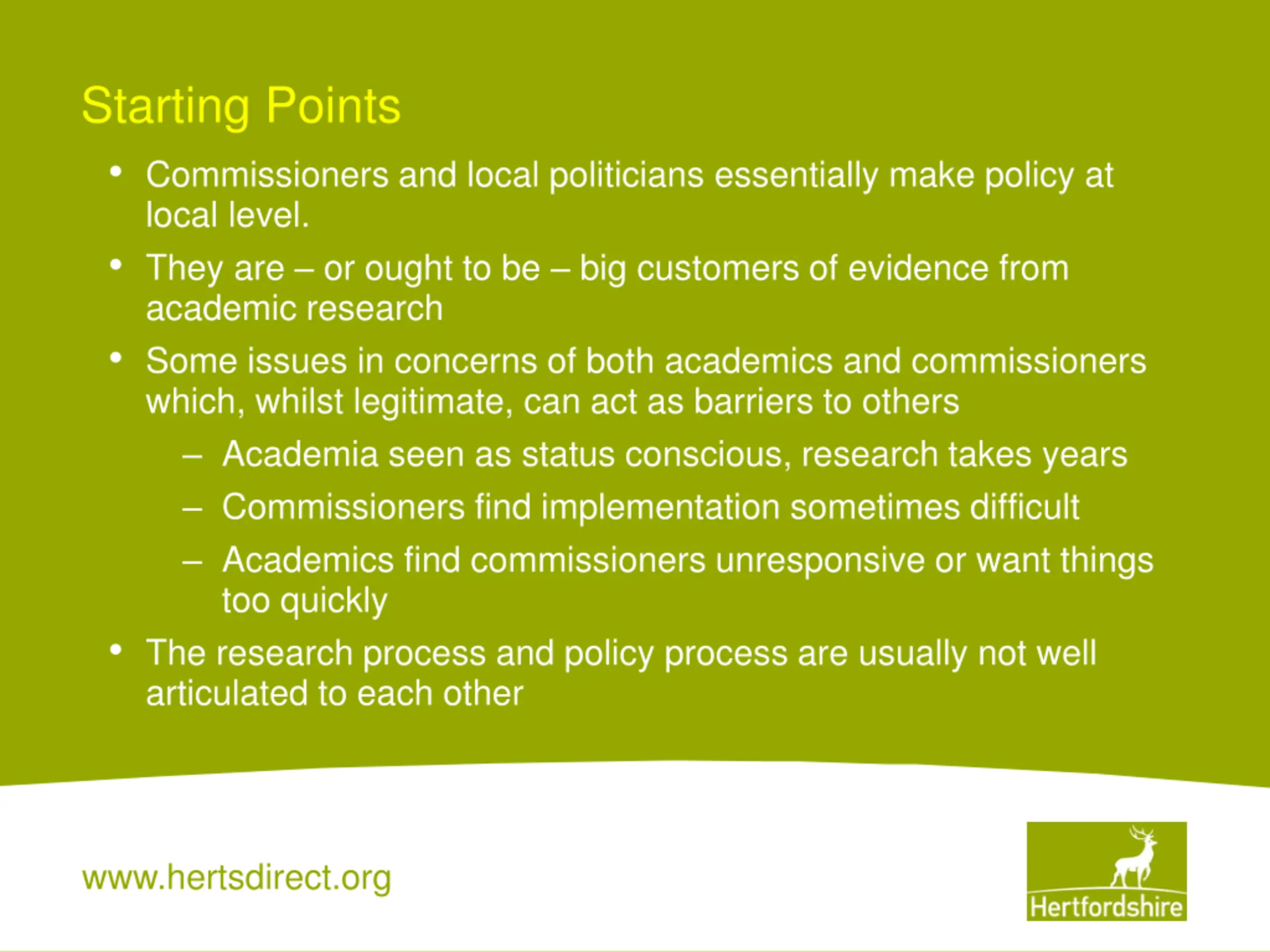 Starting Points Commissioners and local politicians essentially make policy at local level. They are or ought to be big customers of evidence from academic research Some issues in concerns of both academics and commissioners which, whilst legitimate, can act as barriers to others Academia seen as status conscious, research takes years Commissioners find implementation sometimes difficult Academics find commissioners unresponsive or want things too quickly The research process and policy process are usually not well articulated to each other www.hertsdirect.org