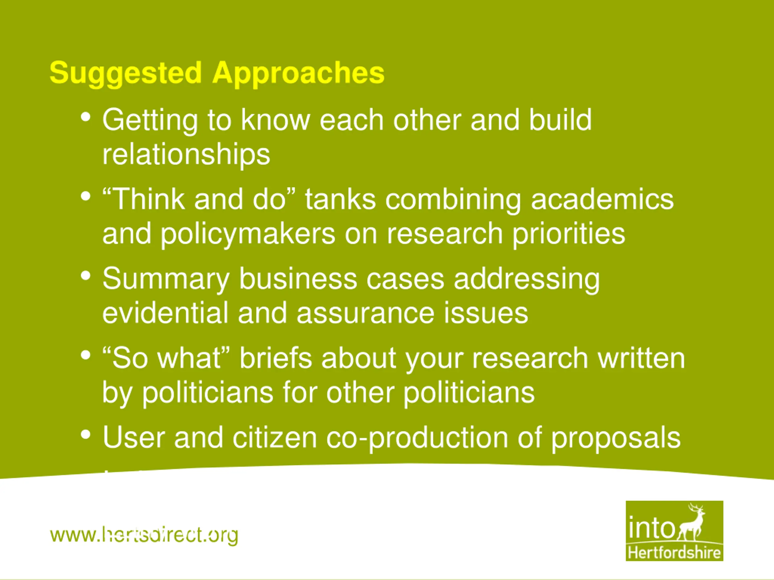 Suggested Approaches Getting to know each other and build relationships Think and do tanks combining academics and policymakers on research priorities Summary business cases addressing evidential and assurance issues So what briefs about your research written by politicians for other politicians User and citizen co-production of proposals Independent statement or scrutiny www.hertsdirect.org Early warning and debate before going into public domain for decision