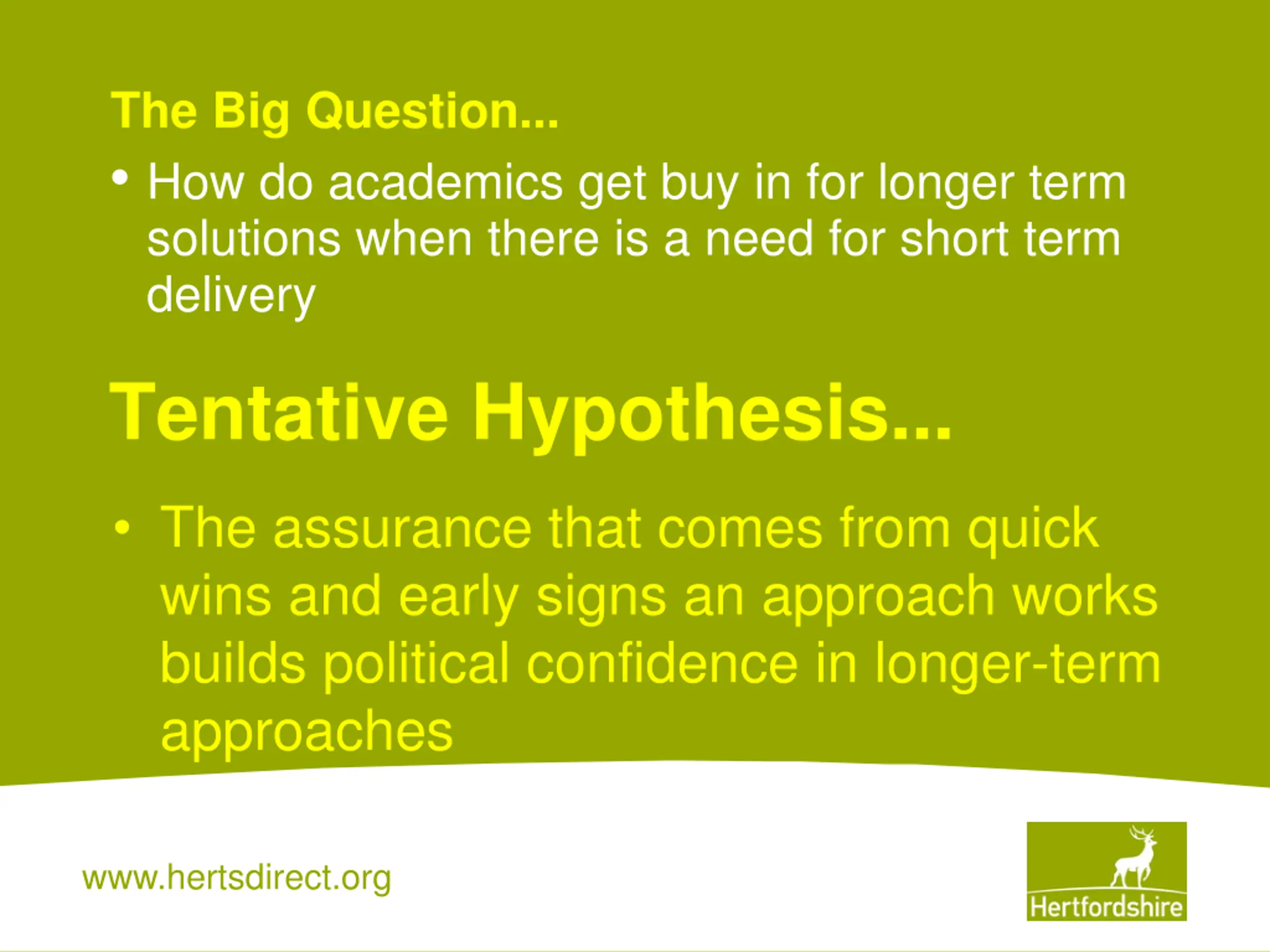 The Big Question... How do academics get buy in for longer term solutions when there is a need for short term delivery Tentative Hypothesis... The assurance that comes from quick wins and early signs an approach works builds political confidence in longer-term approaches www.hertsdirect.org