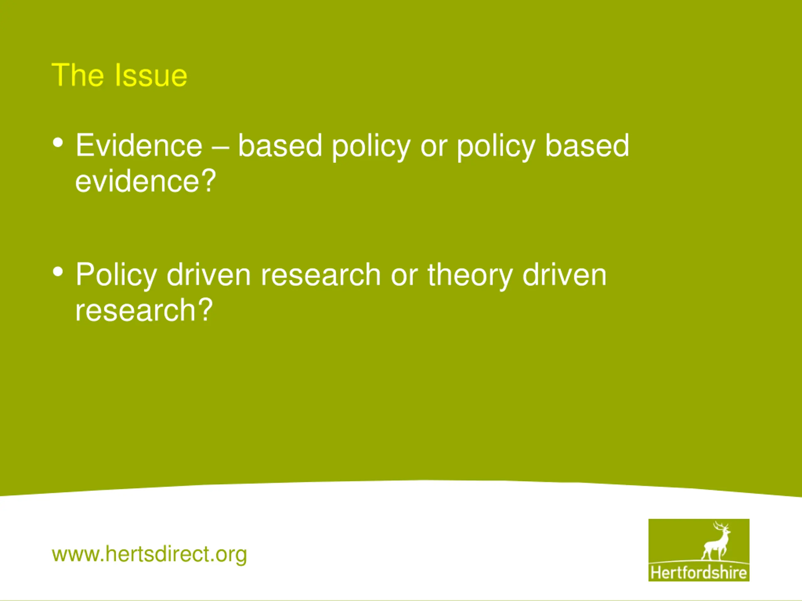 The Issue Evidence based policy or policy based evidence? Policy driven research or theory driven research? www.hertsdirect.org