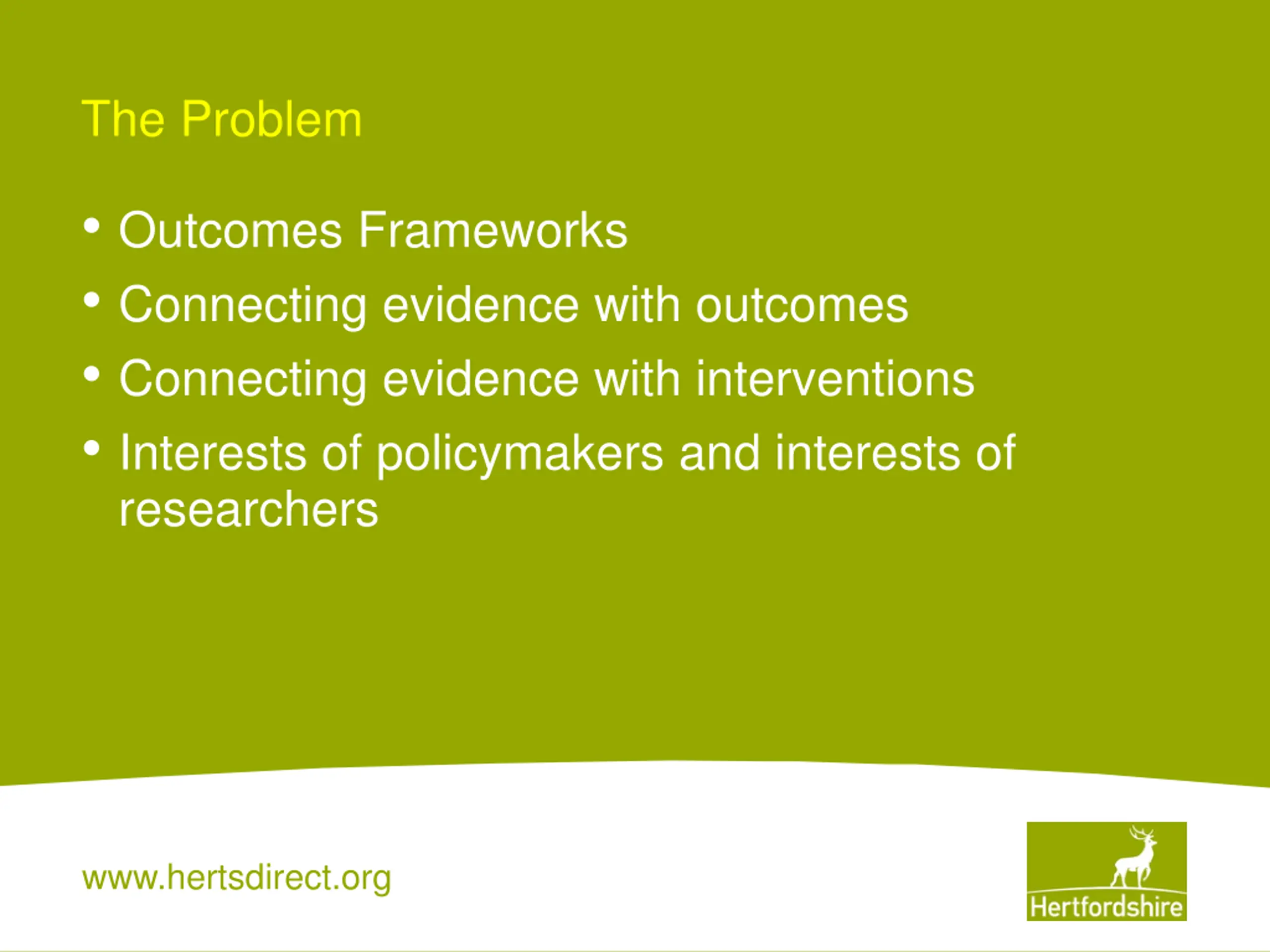 The Problem Outcomes Frameworks Connecting evidence with outcomes Connecting evidence with interventions Interests of policymakers and interests of researchers www.hertsdirect.org