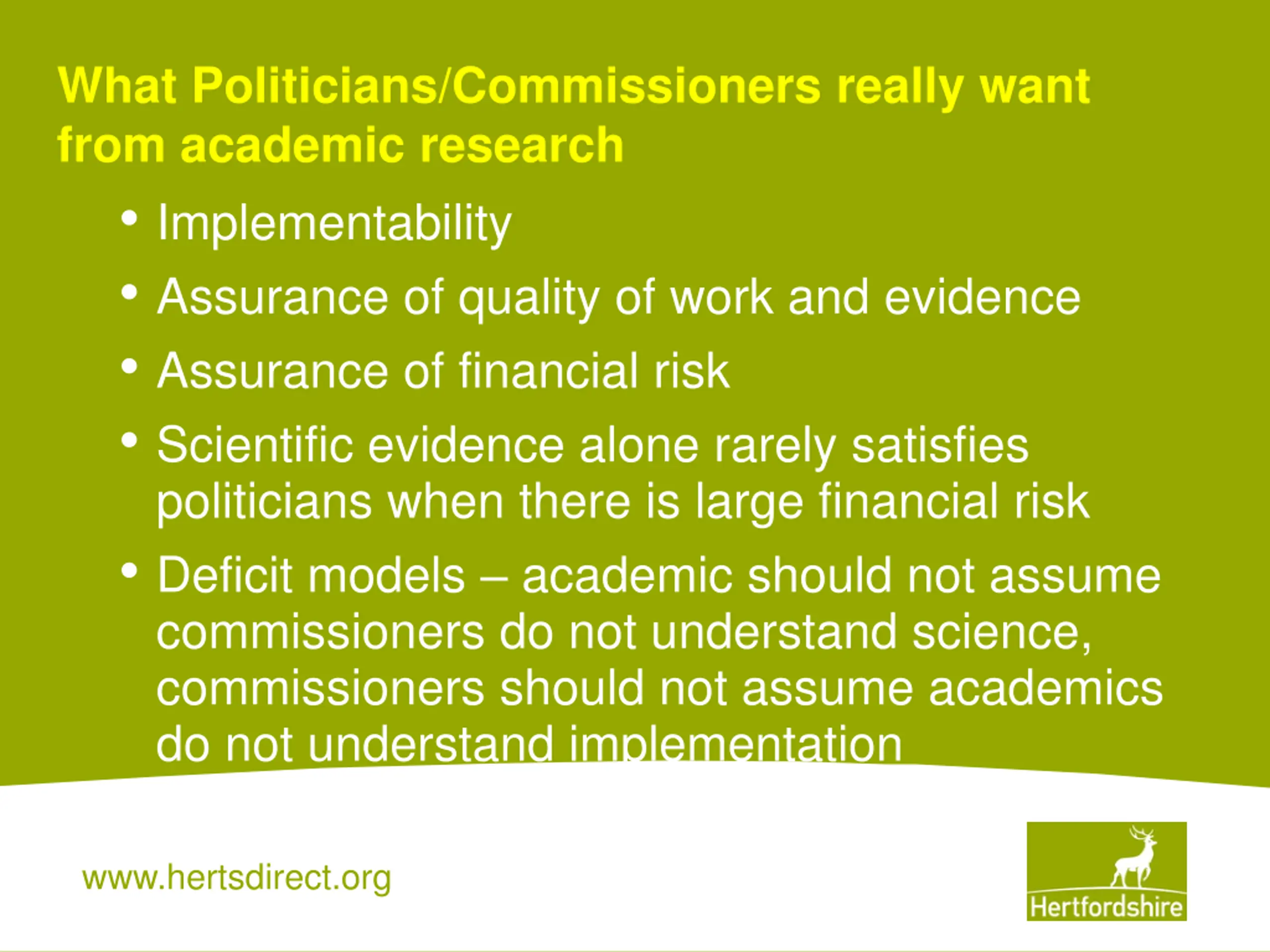 What Politicians/Commissioners really want from academic research Implementability Assurance of quality of work and evidence Assurance of financial risk Scientific evidence alone rarely satisfies politicians when there is large financial risk Deficit models academic should not assume commissioners do not understand science, commissioners should not assume academics do not understand implementation www.hertsdirect.org