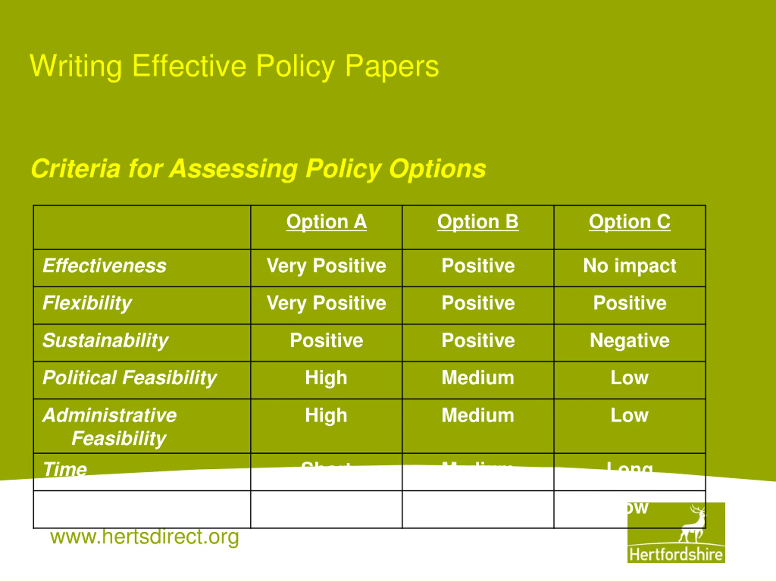 Writing Effective Policy Papers Criteria for Assessing Policy Options Option A Option B Option C Effectiveness Very Positive Positive No impact Flexibility Very Positive Positive Positive Sustainability Positive Positive Negative Political Feasibility High Medium Low Administrative Feasibility Time High Medium Low Short Medium Long Cost High Medium Low www.hertsdirect.org