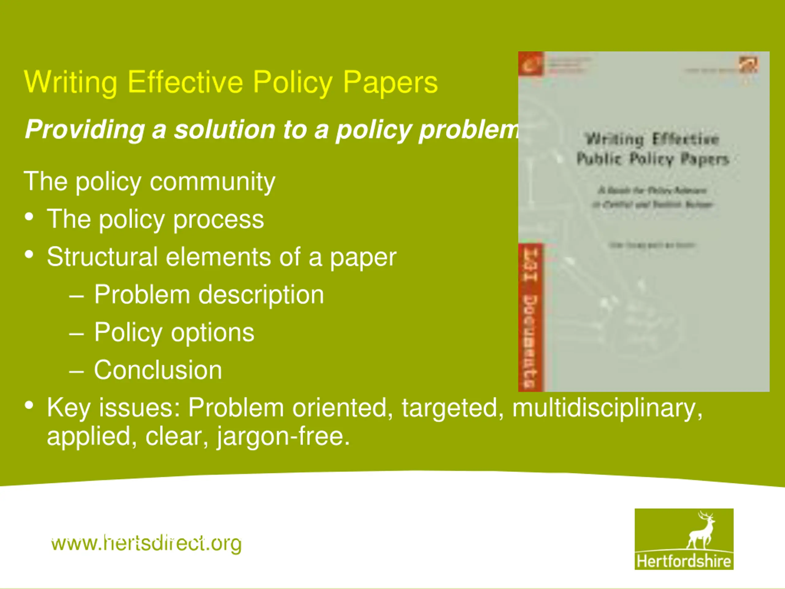 Writing Effective Policy Papers Providing a solution to a policy problem The policy community The policy process Structural elements of a paper Problem description Policy options Conclusion Key issues: Problem oriented, targeted, multidisciplinary, applied, clear, jargon-free. [Source: Young and Quinn, 2002] www.hertsdirect.org
