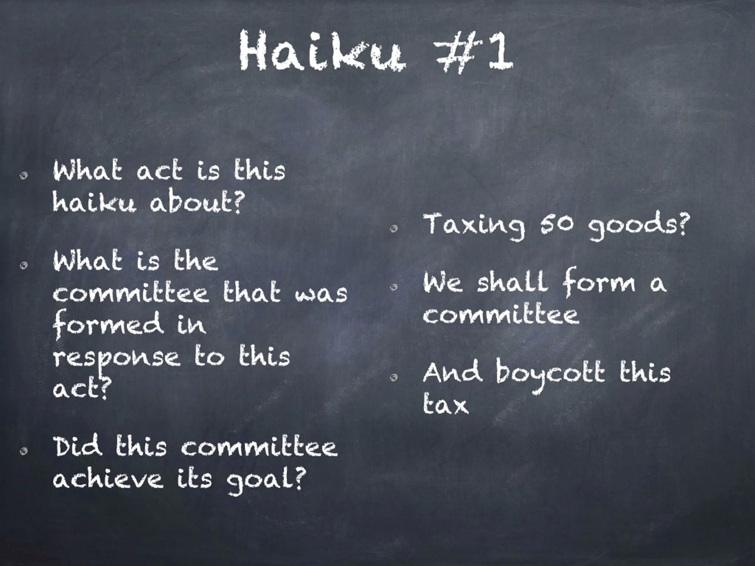 Haiku #1 What act is this haiku about? Taxing 50 goods? What is the committee that was formed in response to this act? We shall form a committee And boycott this tax Did this committee achieve its goal?