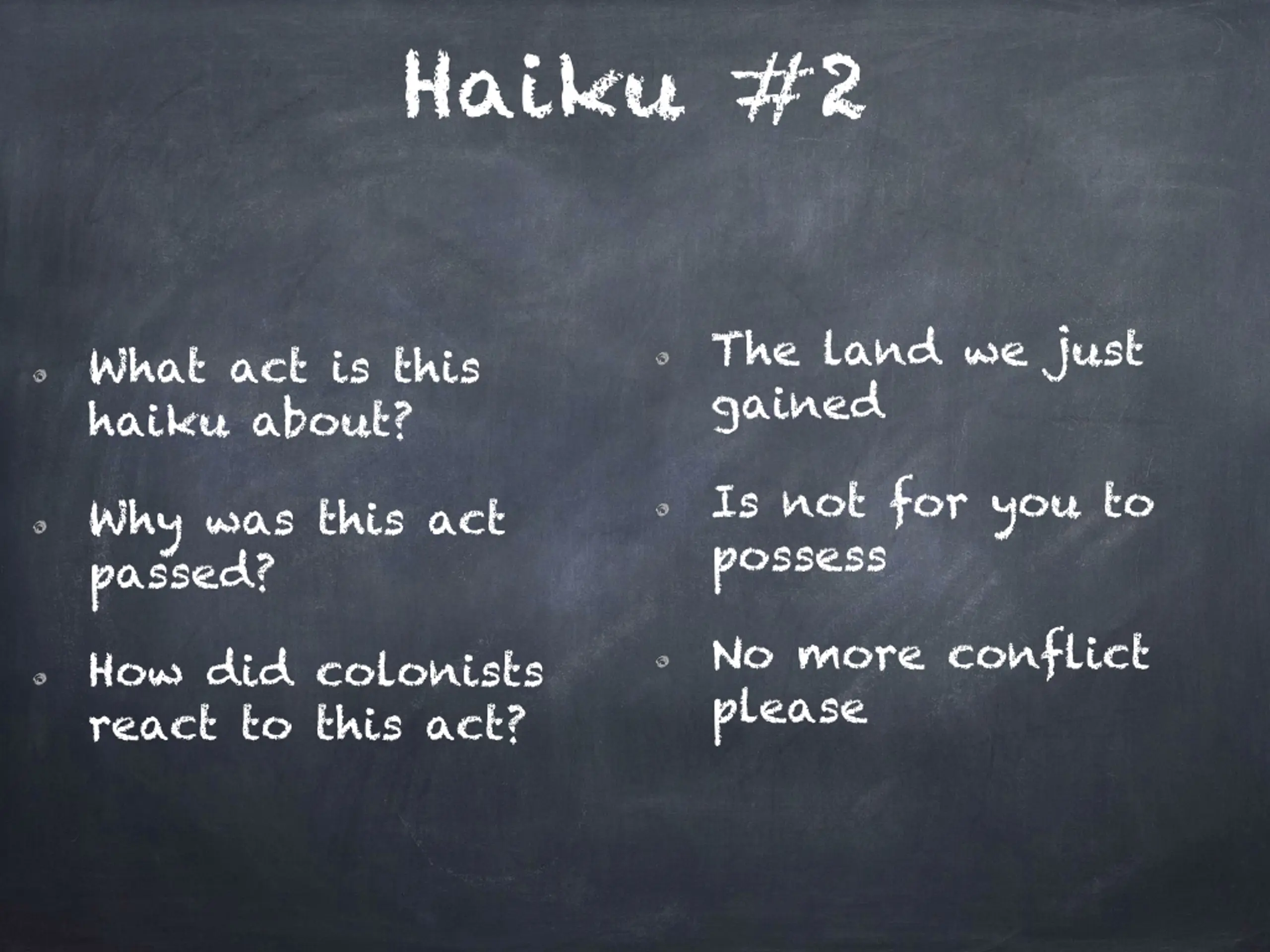 Haiku #2 The land we just gained What act is this haiku about? Is not for you to possess Why was this act passed? No more conflict please How did colonists react to this act?