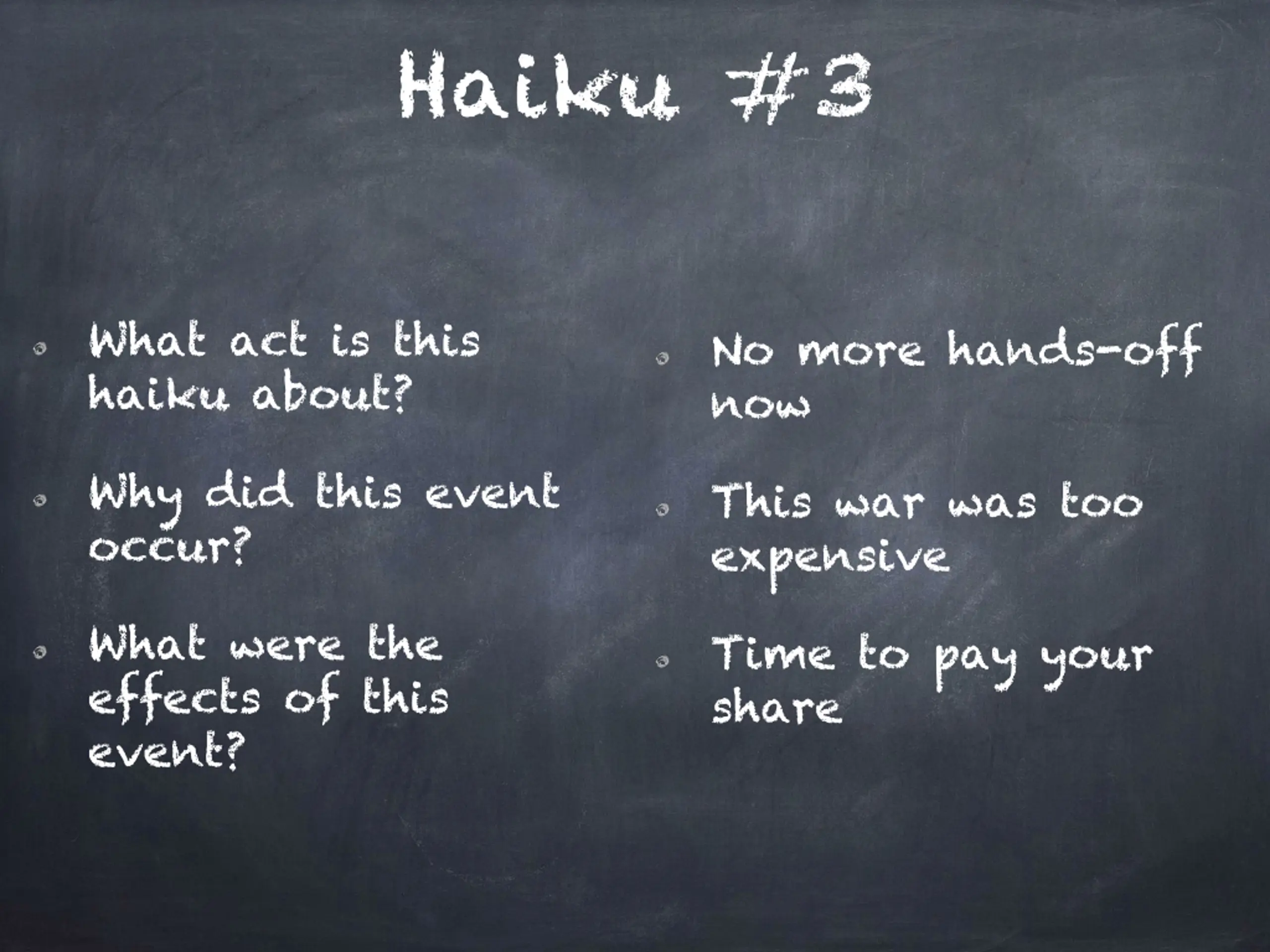 Haiku #3 What act is this haiku about? No more hands-off now Why did this event occur? This war was too expensive What were the effects of this event? Time to pay your share