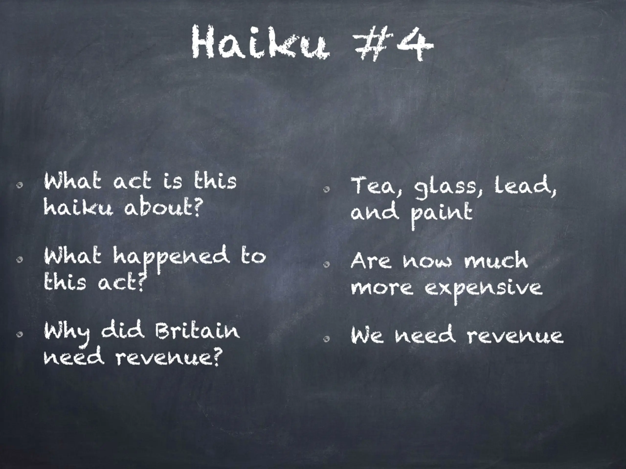 Haiku #4 What act is this haiku about? Tea, glass, lead, and paint What happened to this act? Are now much more expensive Why did Britain need revenue? We need revenue