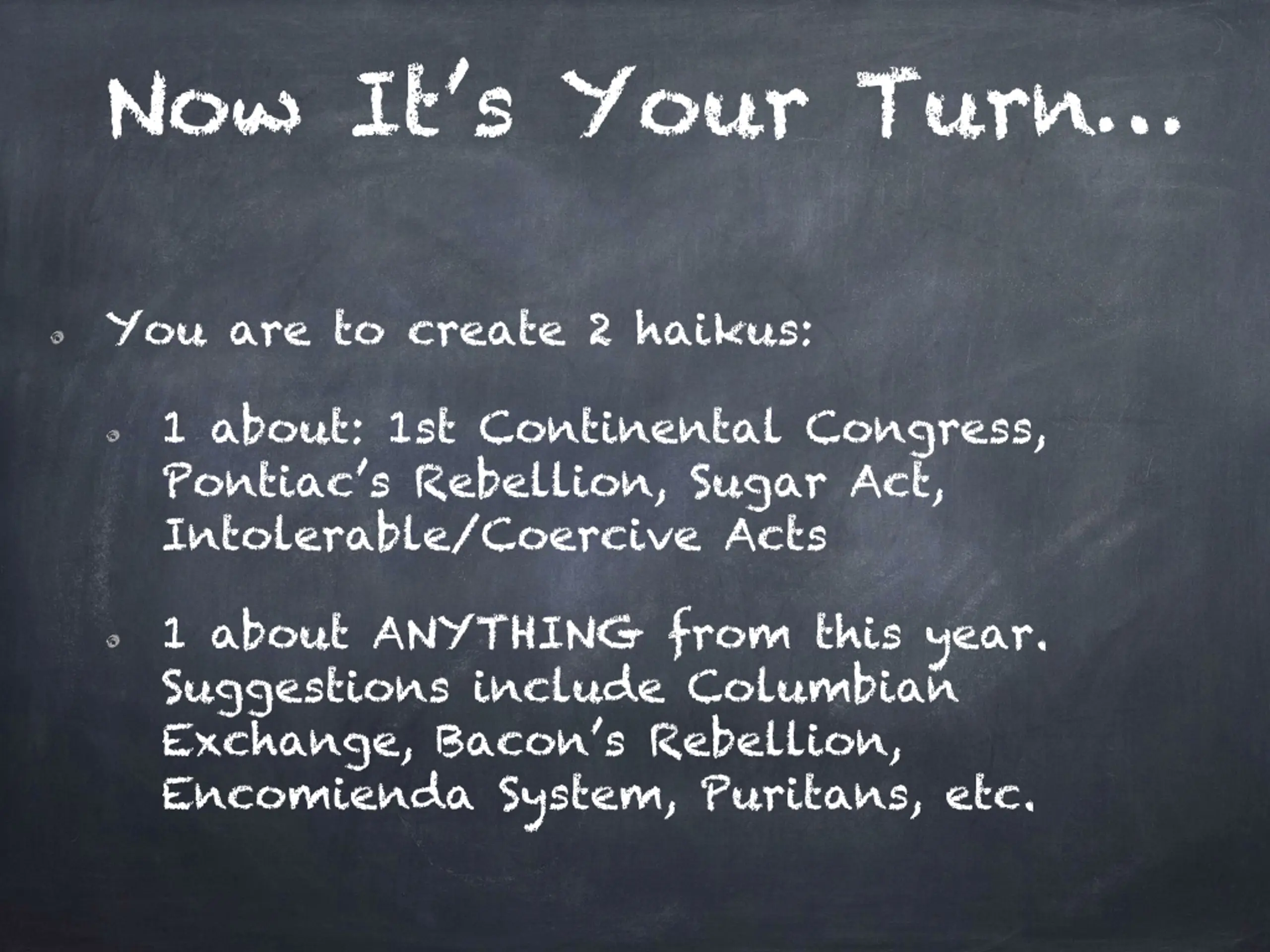 Now Its Your Turn You are to create 2 haikus: 1 about: 1st Continental Congress, Pontiac s Rebellion, Sugar Act, Intolerable/Coercive Acts 1 about ANYTHING from this year. Suggestions include Columbian Exchange, Bacon s Rebellion, Encomienda System, Puritans, etc.