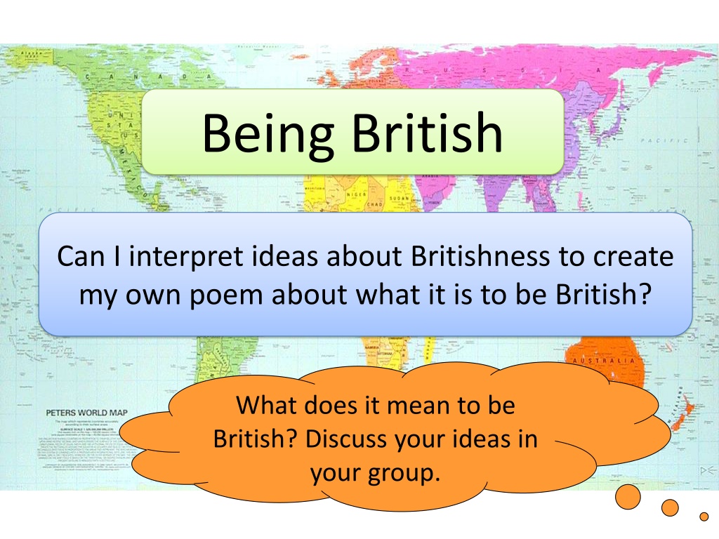 Being British Can I interpret ideas about Britishness to create my own poem about what it is to be British? What does it mean to be British? Discuss your ideas in your group.