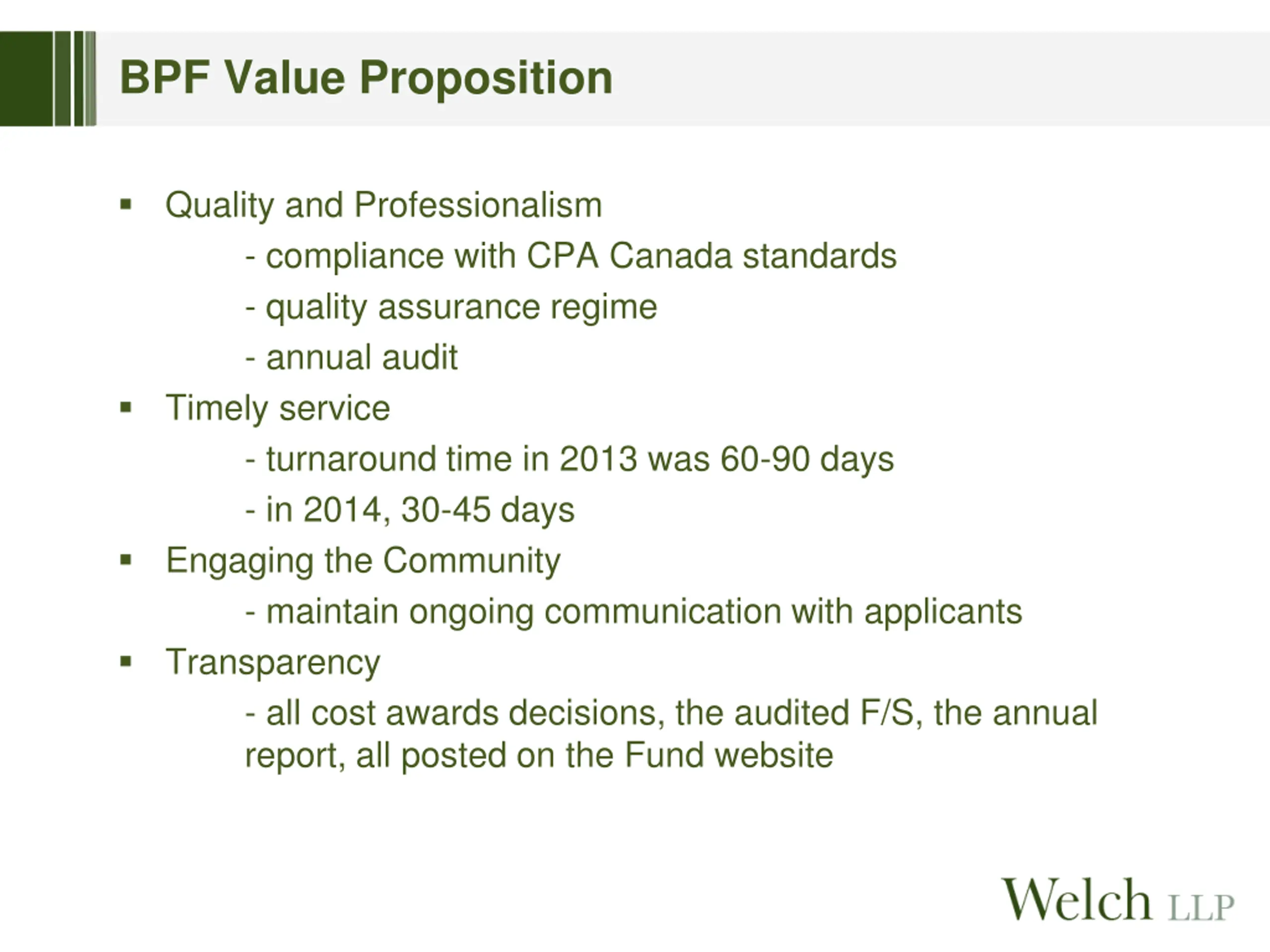 BPF Value Proposition Quality and Professionalism - compliance with CPA Canada standards - quality assurance regime - annual audit Timely service - turnaround time in 2013 was 60-90 days - in 2014, 30-45 days Engaging the Community - maintain ongoing communication with applicants Transparency - all cost awards decisions, the audited F/S, the annual report, all posted on the Fund website