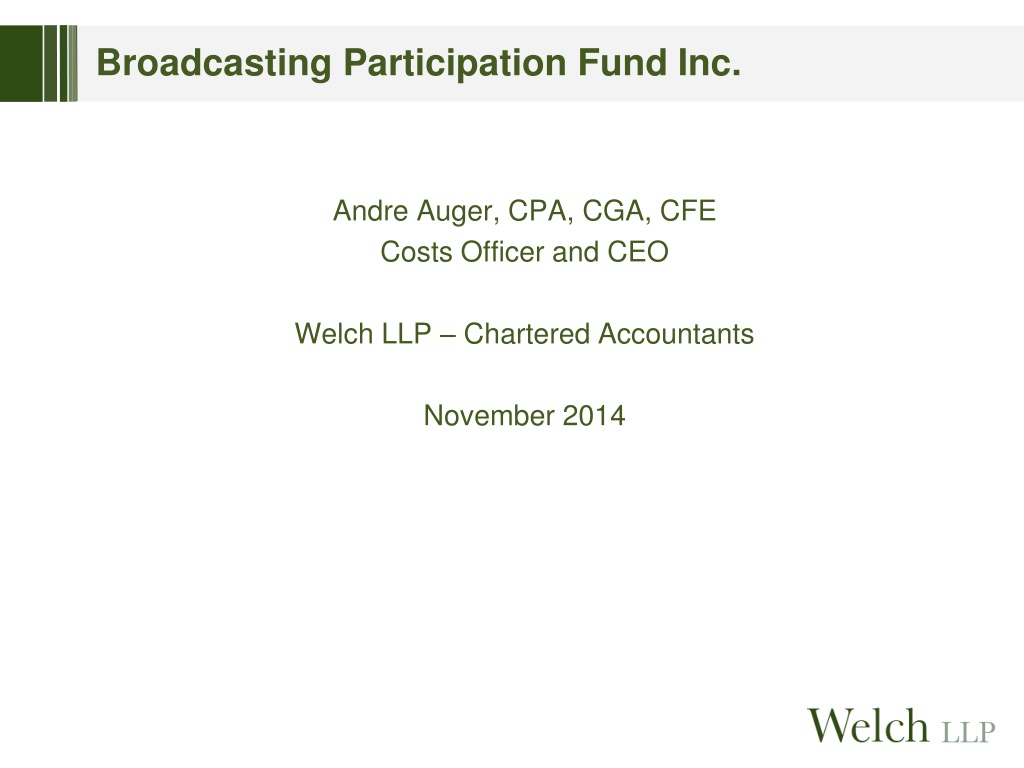 Broadcasting Participation Fund Inc. Andre Auger, CPA, CGA, CFE Costs Officer and CEO Welch LLP Chartered Accountants November 2014
