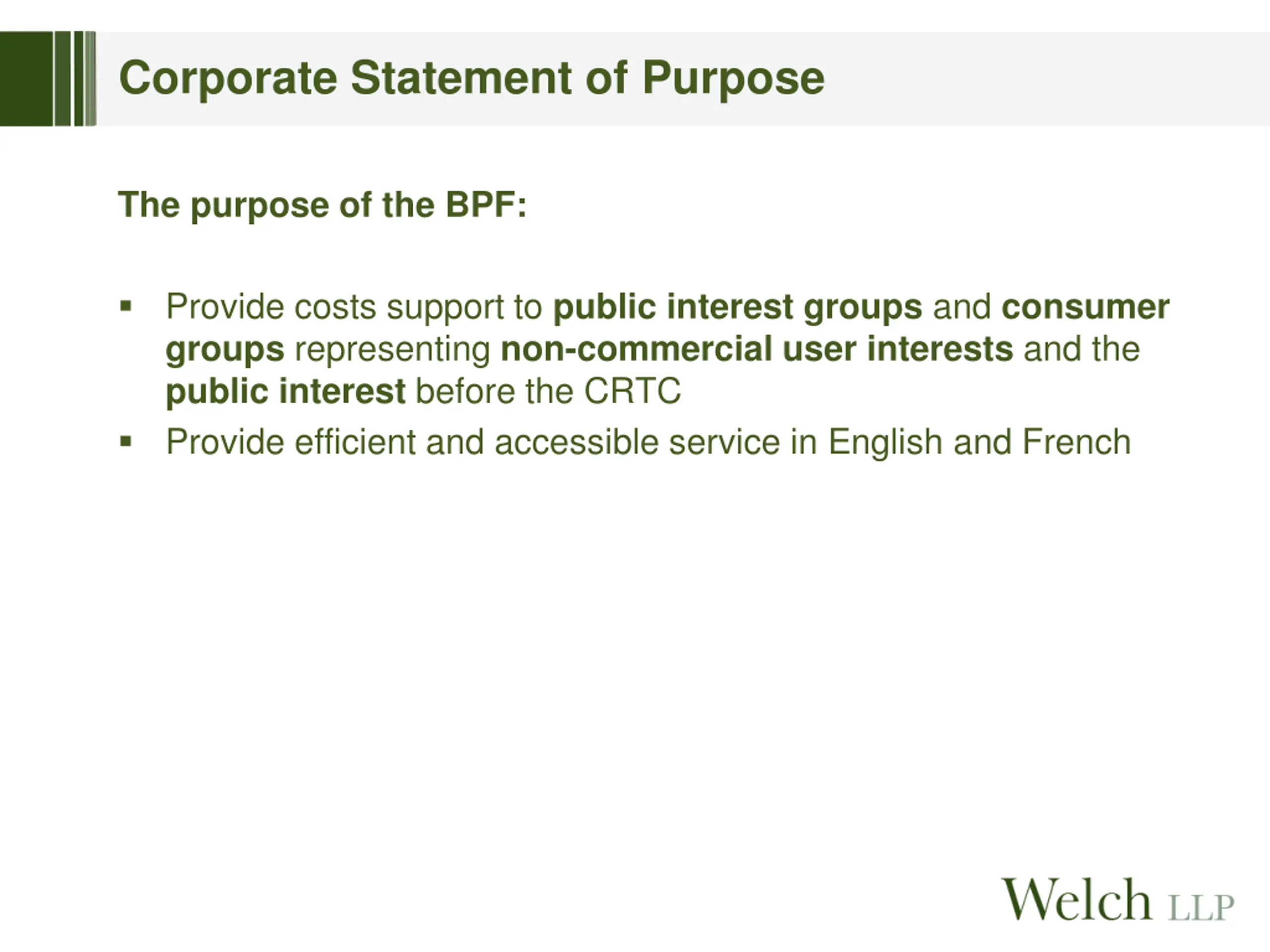 Corporate Statement of Purpose The purpose of the BPF: Provide costs support to public interest groups and consumer groups representing non-commercial user interests and the public interest before the CRTC Provide efficient and accessible service in English and French