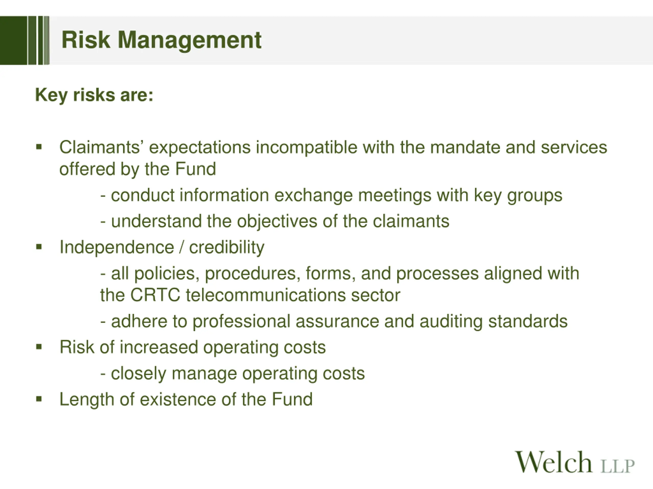 Risk Management Key risks are: Claimants expectations incompatible with the mandate and services offered by the Fund - conduct information exchange meetings with key groups - understand the objectives of the claimants Independence / credibility - all policies, procedures, forms, and processes aligned with the CRTC telecommunications sector - adhere to professional assurance and auditing standards Risk of increased operating costs - closely manage operating costs Length of existence of the Fund