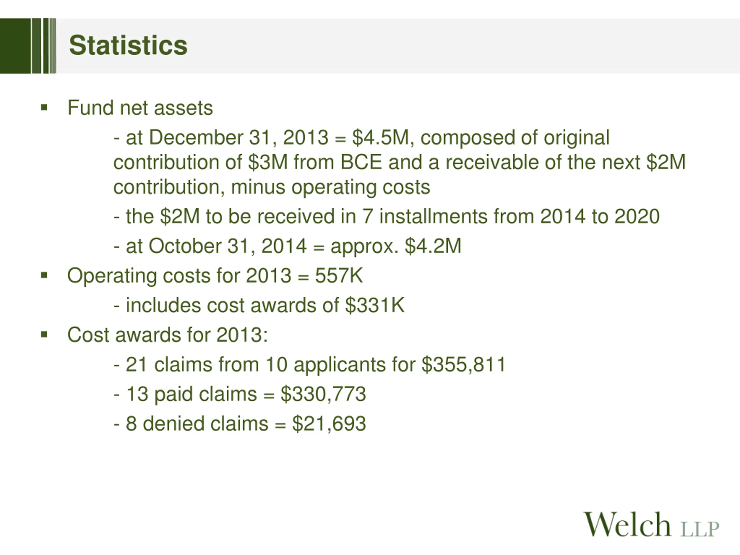 Statistics Fund net assets - at December 31, 2013 = $4.5M, composed of original contribution of $3M from BCE and a receivable of the next $2M contribution, minus operating costs - the $2M to be received in 7 installments from 2014 to 2020 - at October 31, 2014 = approx. $4.2M Operating costs for 2013 = 557K - includes cost awards of $331K Cost awards for 2013: - 21 claims from 10 applicants for $355,811 - 13 paid claims = $330,773 - 8 denied claims = $21,693