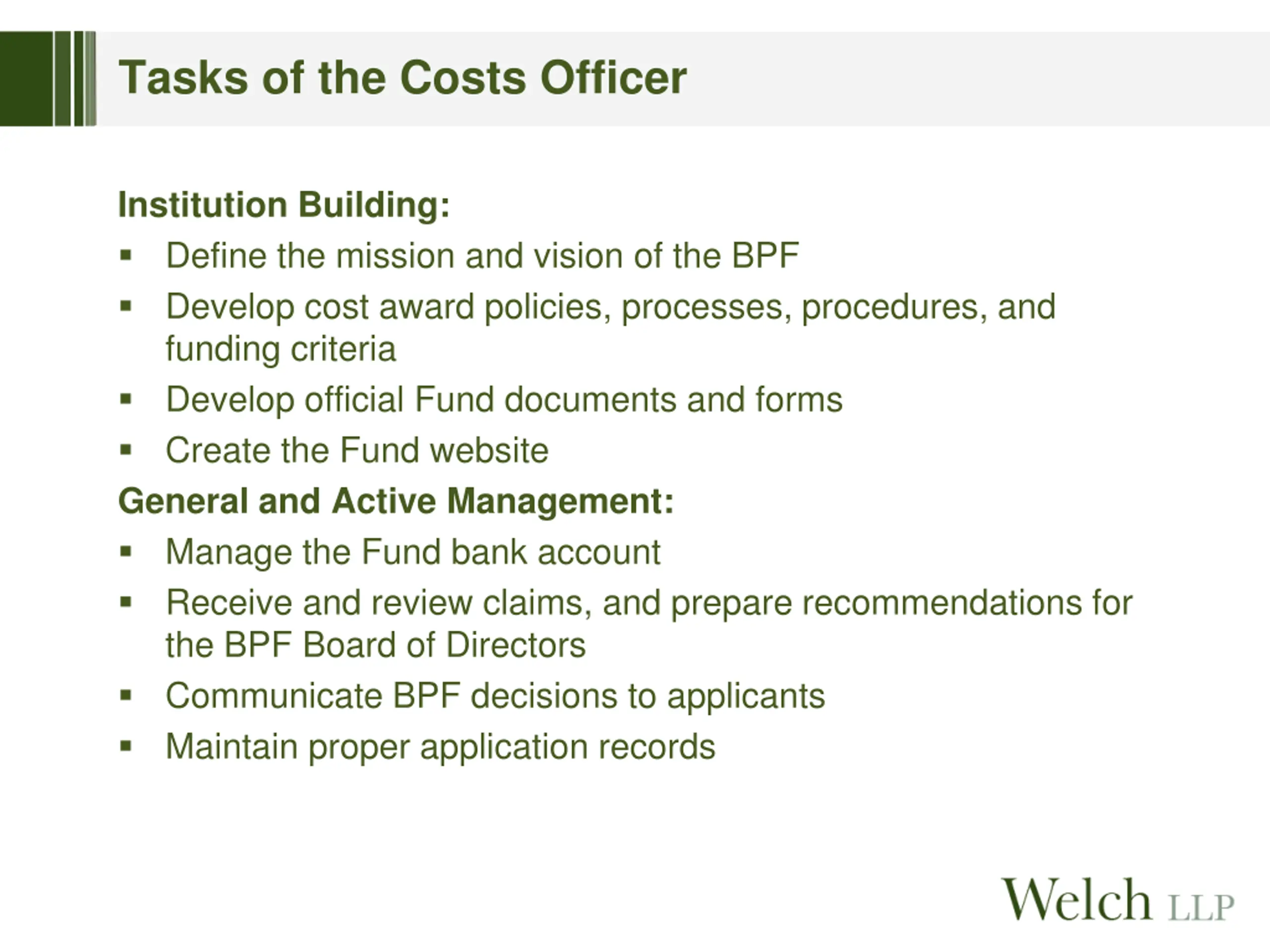 Tasks of the Costs Officer Institution Building: Define the mission and vision of the BPF Develop cost award policies, processes, procedures, and funding criteria Develop official Fund documents and forms Create the Fund website General and Active Management: Manage the Fund bank account Receive and review claims, and prepare recommendations for the BPF Board of Directors Communicate BPF decisions to applicants Maintain proper application records
