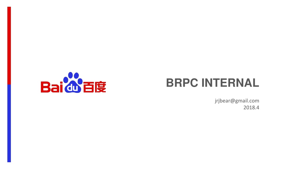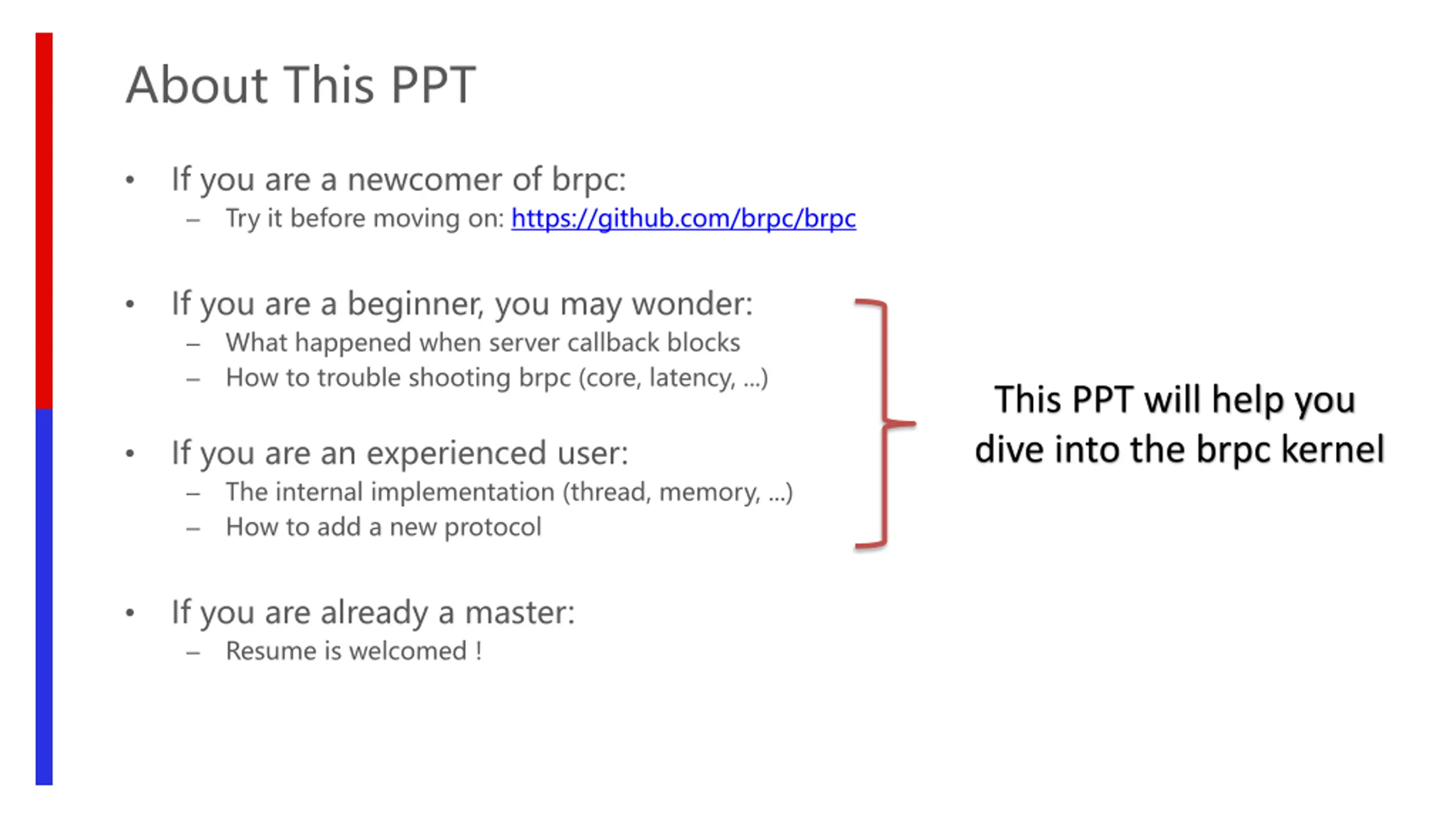 About This PPT If you are a newcomer of brpc: Try it before moving on: https://github.com/brpc/brpc If you are a beginner, you may wonder: What happened when server callback blocks How to trouble shooting brpc (core, latency, ...) This PPT will help you dive into the brpc kernel If you are an experienced user: The internal implementation (thread, memory, ...) How to add a new protocol If you are already a master: Resume is welcomed !