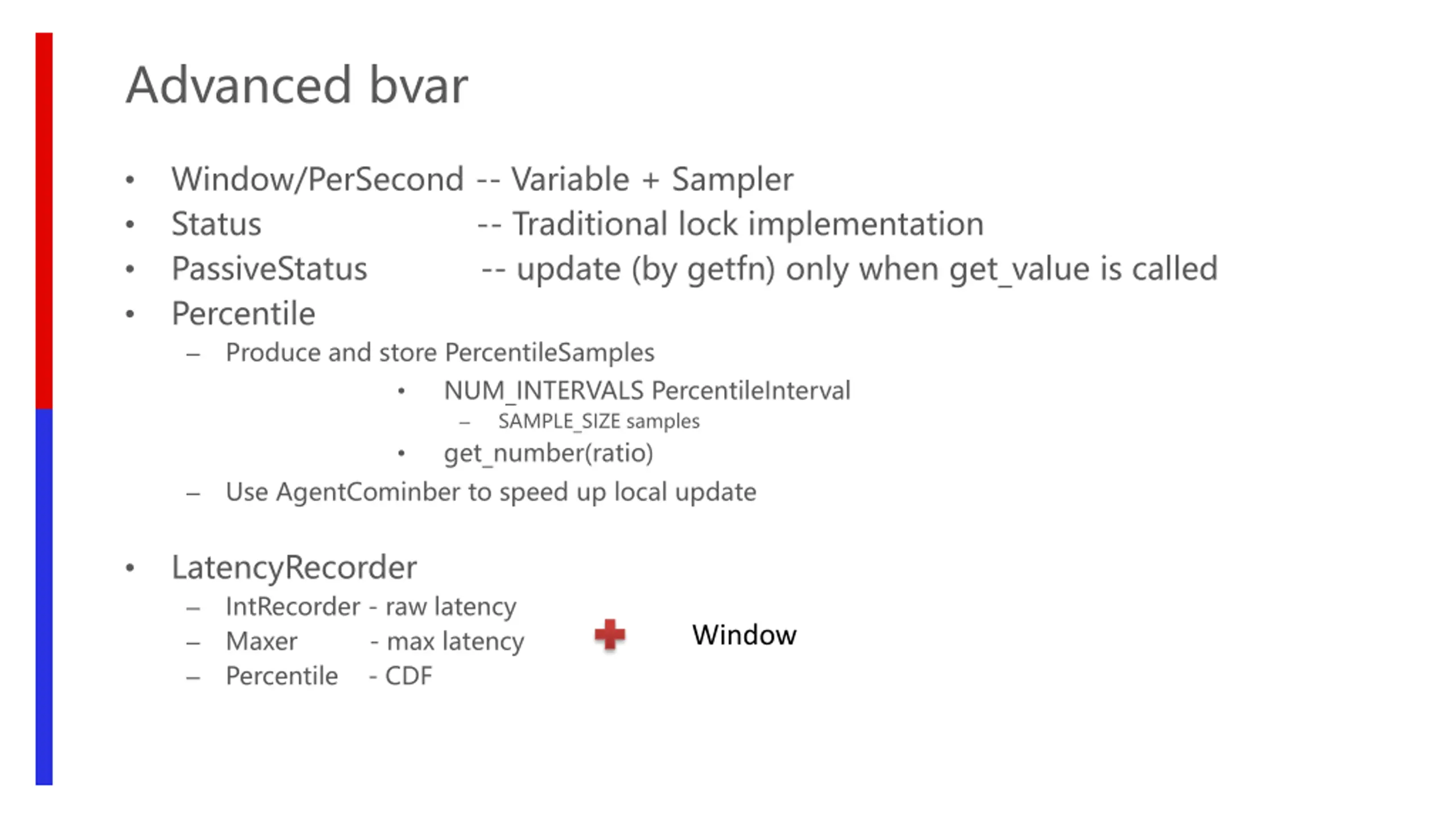 Advanced bvar Window/PerSecond -- Variable + Sampler Status -- Traditional lock implementation PassiveStatus -- update (by getfn) only when get_value is called Percentile Produce and store PercentileSamples NUM_INTERVALS PercentileInterval SAMPLE_SIZE samples get_number(ratio) Use AgentCominber to speed up local update LatencyRecorder IntRecorder - raw latency Maxer Percentile - CDF Window - max latency