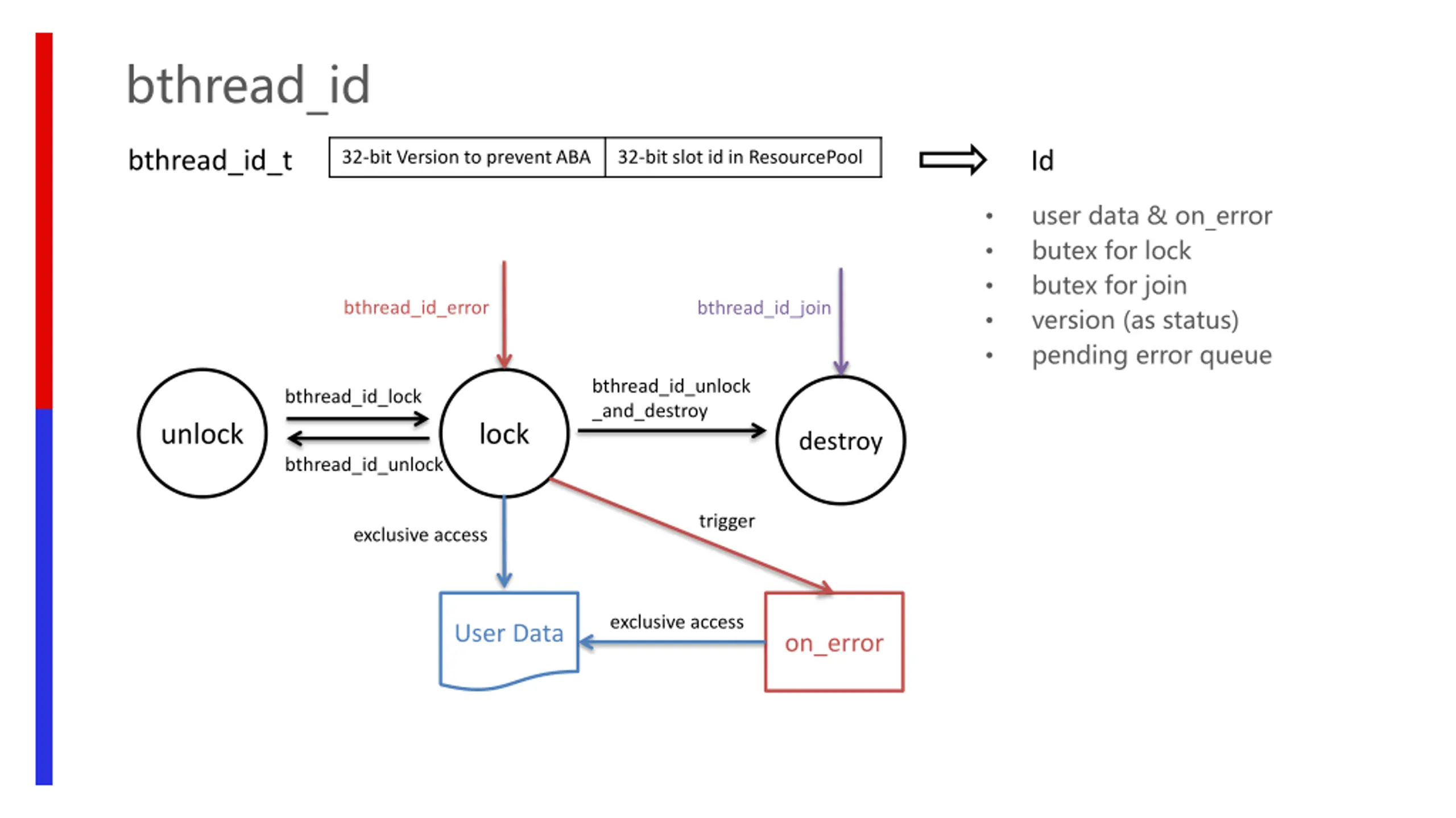 bthread_id bthread_id_t Id 32-bit Version to prevent ABA 32-bit slot id in ResourcePool user data & on_error butex for lock butex for join version (as status) pending error queue bthread_id_error bthread_id_join bthread_id_unlock _and_destroy bthread_id_lock unlock lock destroy bthread_id_unlock trigger exclusive access exclusive access User Data on_error
