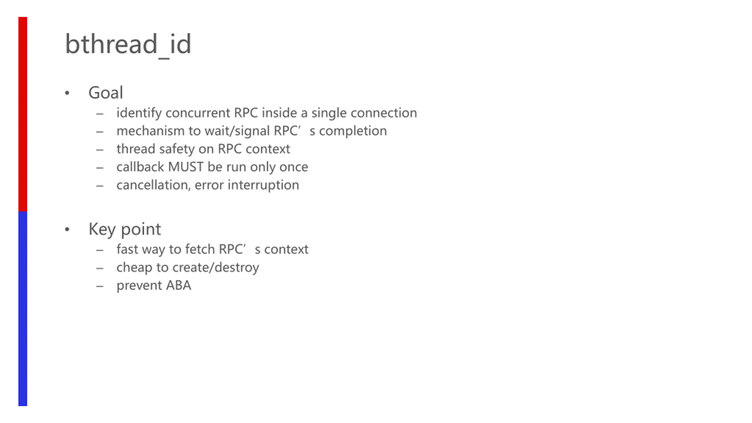 bthread_id Goal identify concurrent RPC inside a single connection mechanism to wait/signal RPC s completion thread safety on RPC context callback MUST be run only once cancellation, error interruption Key point fast way to fetch RPC s context cheap to create/destroy prevent ABA