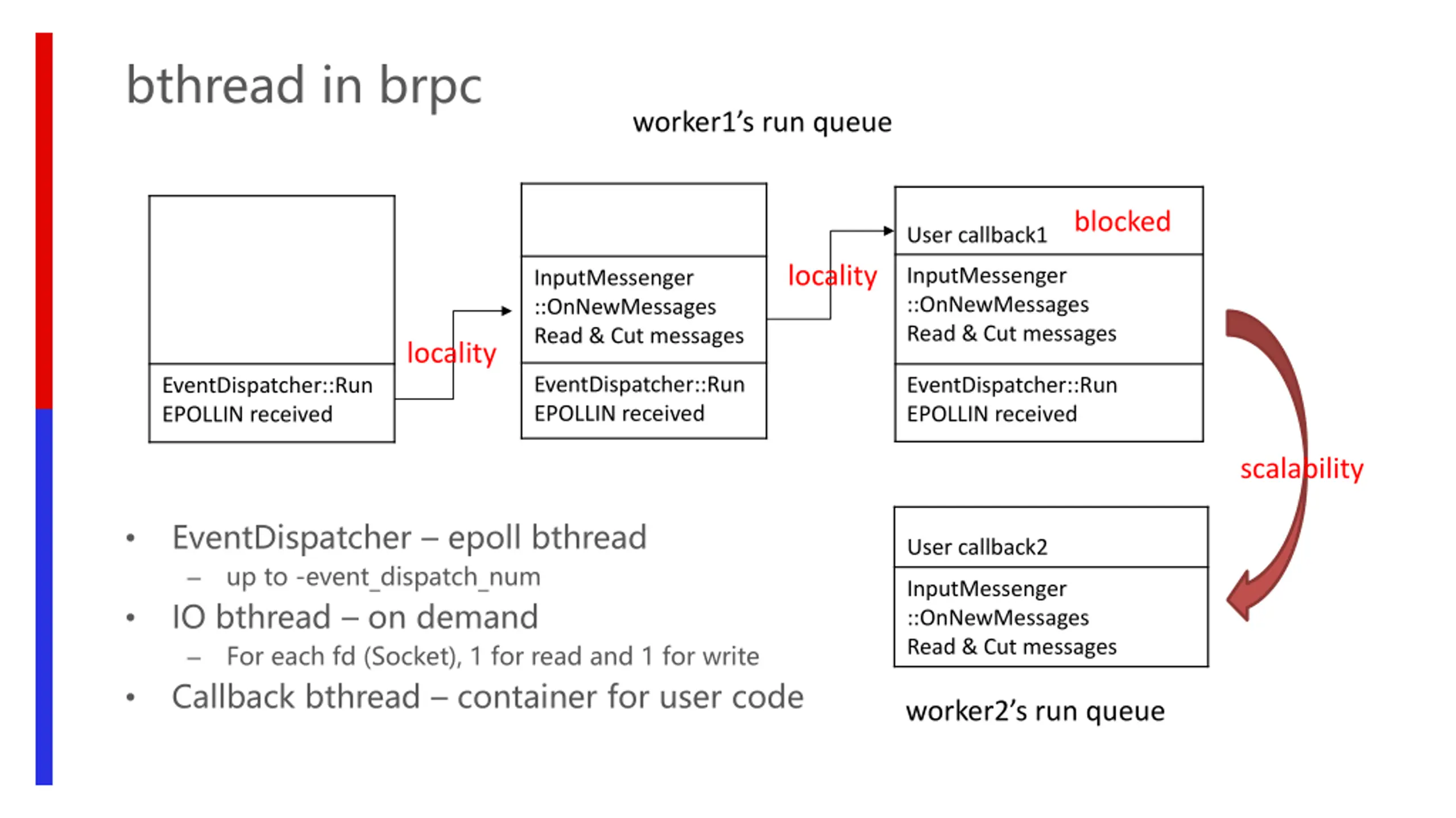 bthread in brpc worker1 s run queue blocked User callback1 locality InputMessenger ::OnNewMessages Read & Cut messages InputMessenger ::OnNewMessages Read & Cut messages locality EventDispatcher::Run EPOLLIN received EventDispatcher::Run EPOLLIN received EventDispatcher::Run EPOLLIN received scalability EventDispatcher epoll bthread up to -event_dispatch_num IO bthread on demand For each fd (Socket), 1 for read and 1 for write Callback bthread container for user code User callback2 InputMessenger ::OnNewMessages Read & Cut messages worker2 s run queue