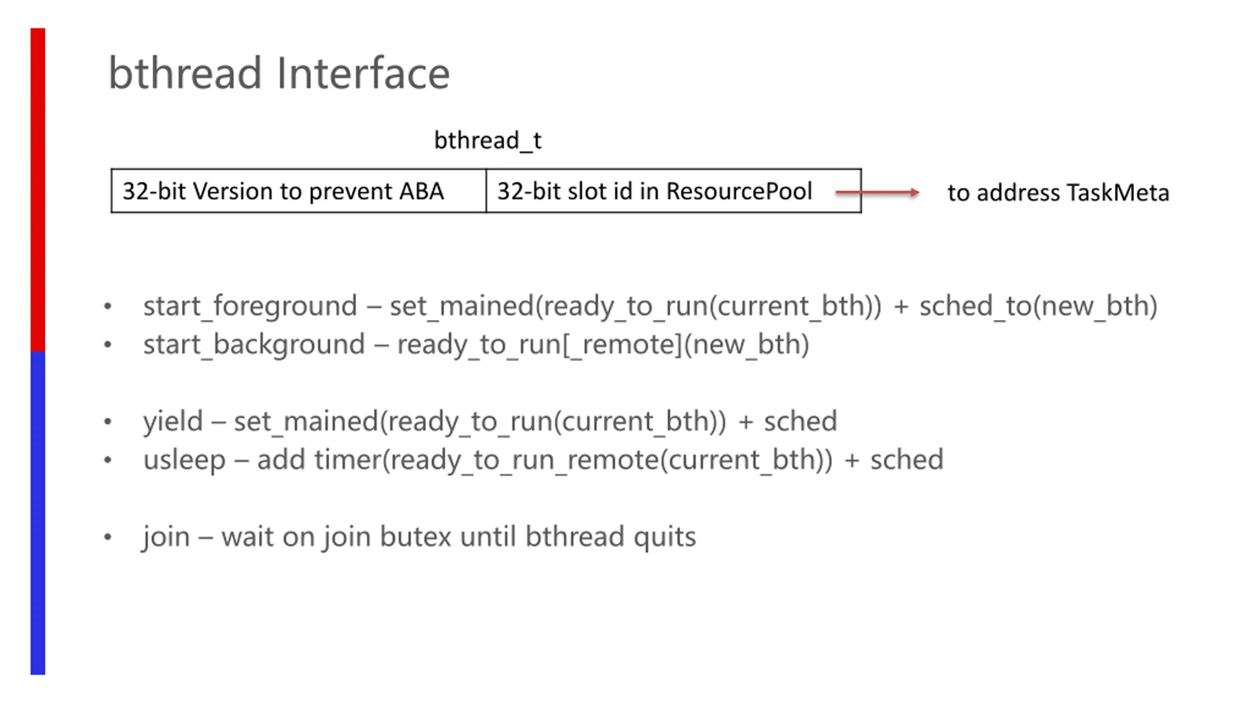 bthread Interface bthread_t 32-bit Version to prevent ABA 32-bit slot id in ResourcePool to address TaskMeta start_foreground set_mained(ready_to_run(current_bth)) + sched_to(new_bth) start_background ready_to_run[_remote](new_bth) yield set_mained(ready_to_run(current_bth)) + sched usleep add timer(ready_to_run_remote(current_bth)) + sched join wait on join butex until bthread quits